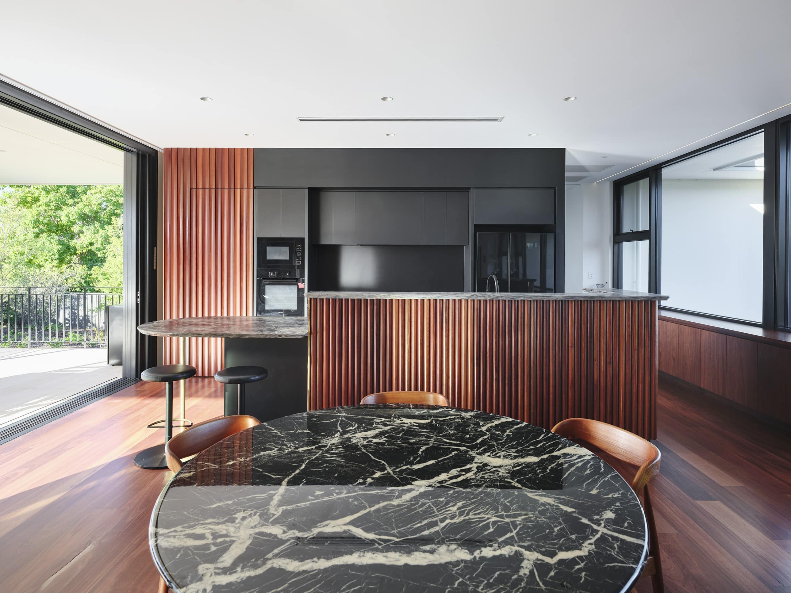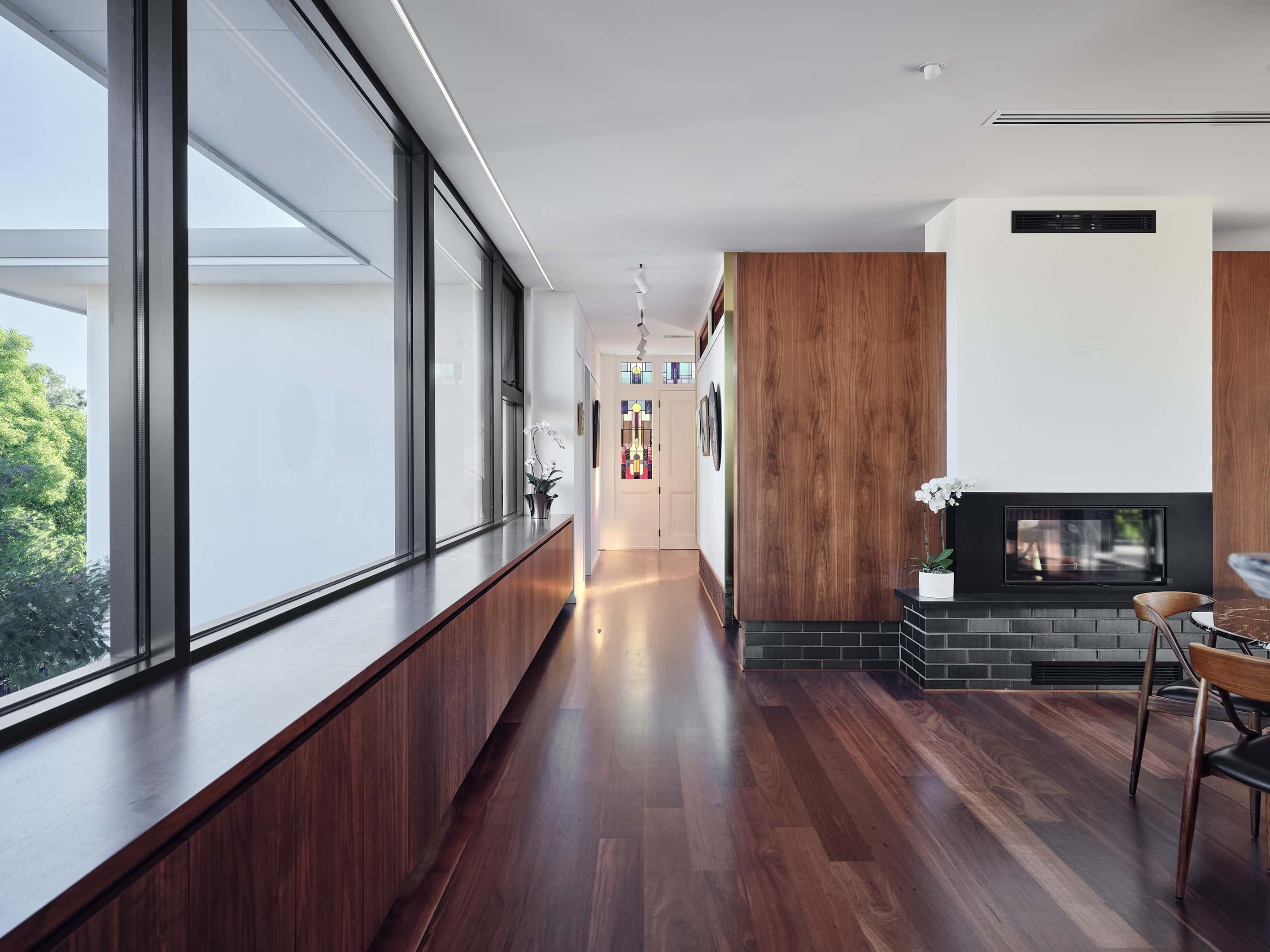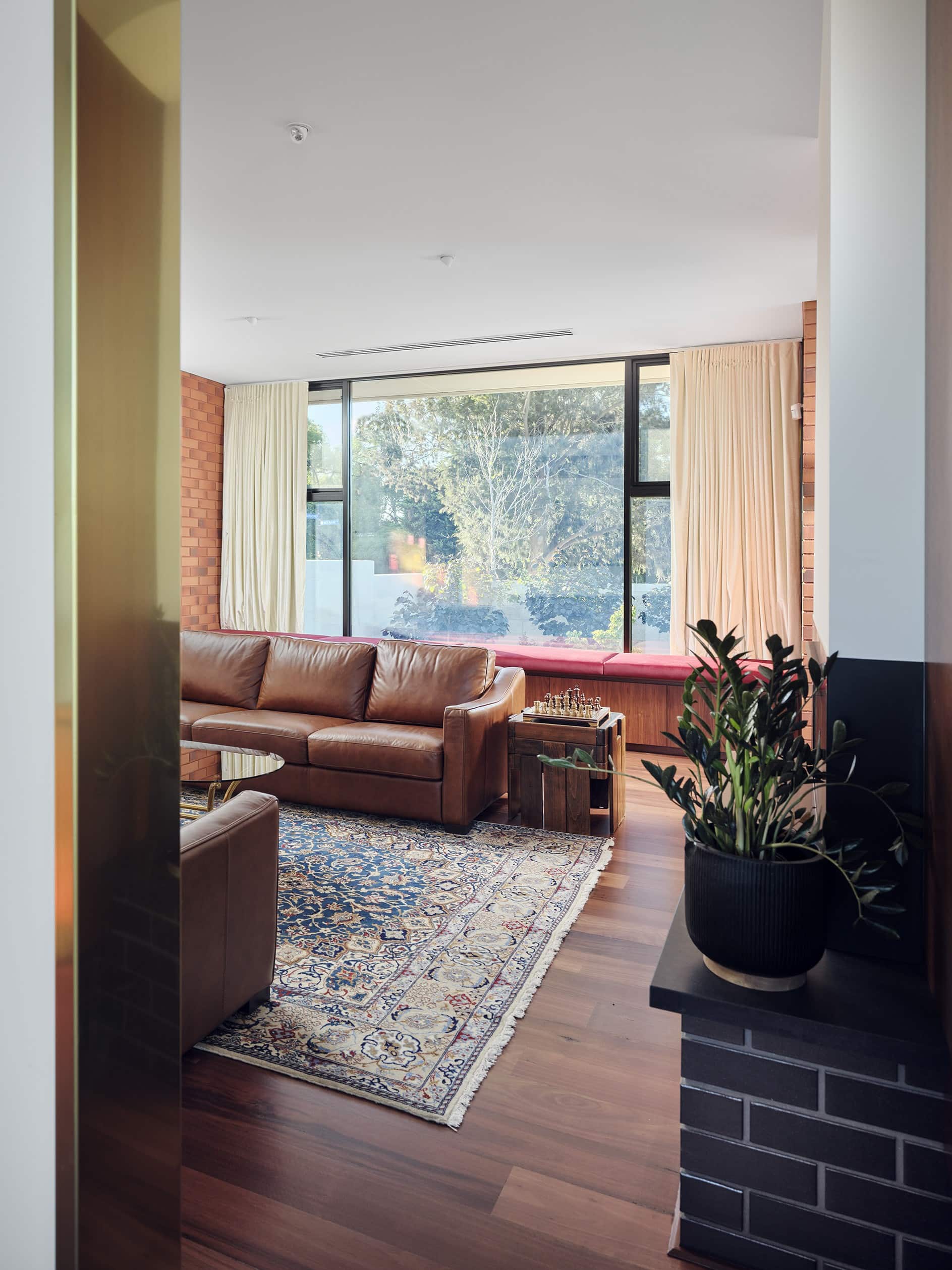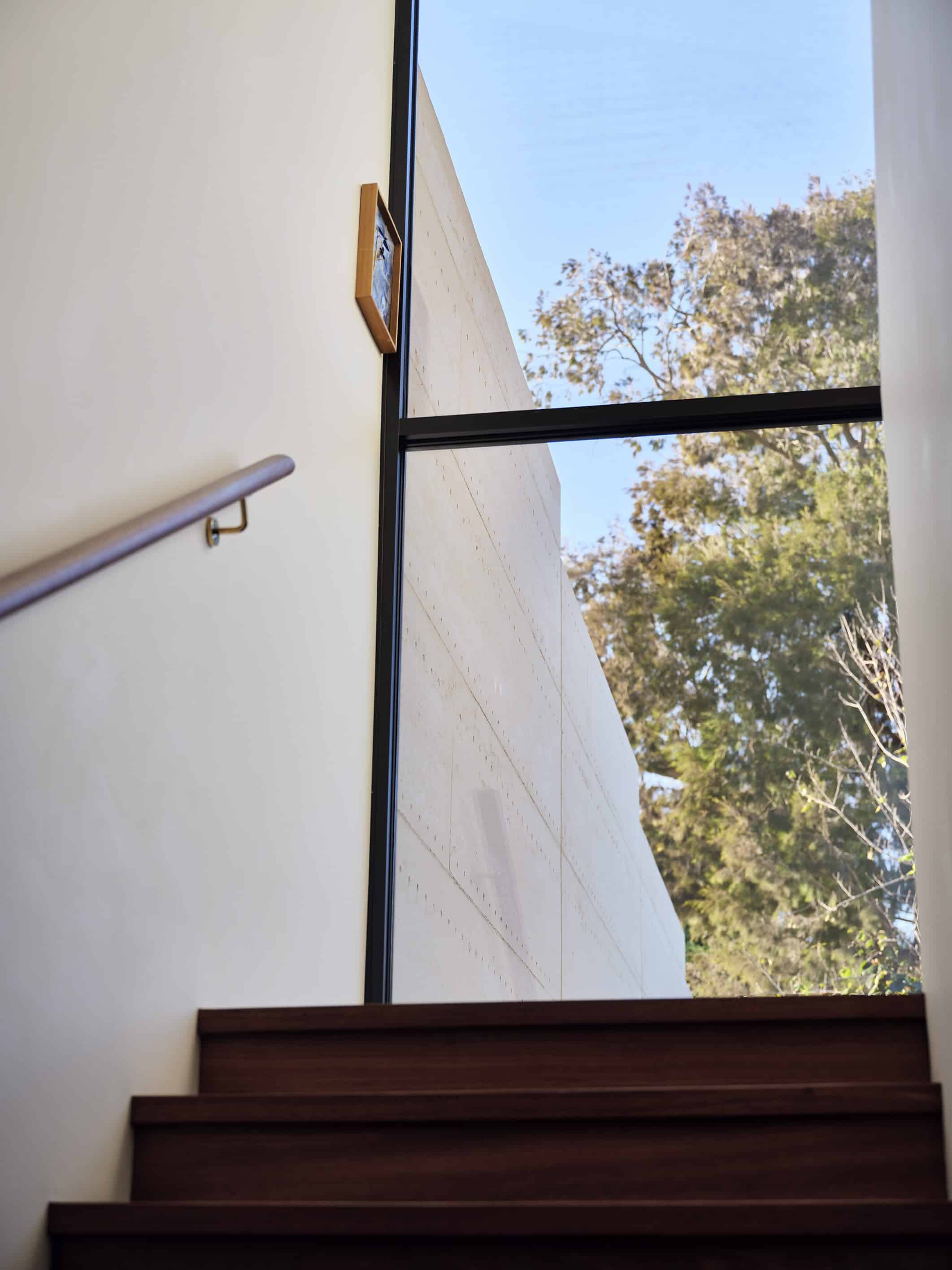 A restrained palette of timber, masonry, stone and glass establishes spatial clarity and supports a gallery-like approach to living, where art, daylight, and the subtle luminosity of brass accents are integral to the architectural experience. With large scale windows overlooking the garden the connection to the sky, clouds and beautiful surrounding tree canopy can be appreciated from spaces throughout the home. The house balances openness with shelter to create a calm, composed domestic environment responsive to climate and context, celebrating warm materiality and texture in a grand yet homely manner.