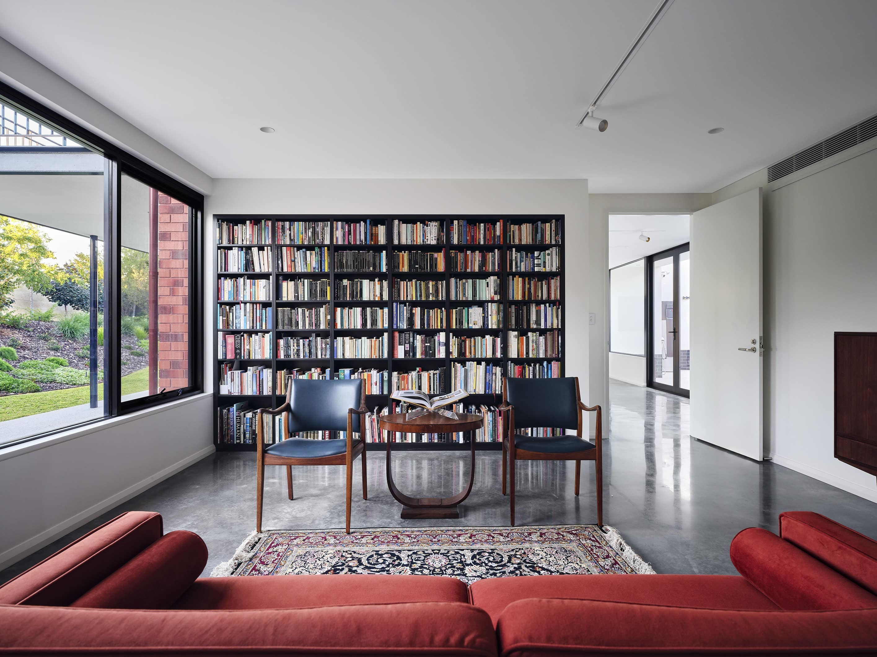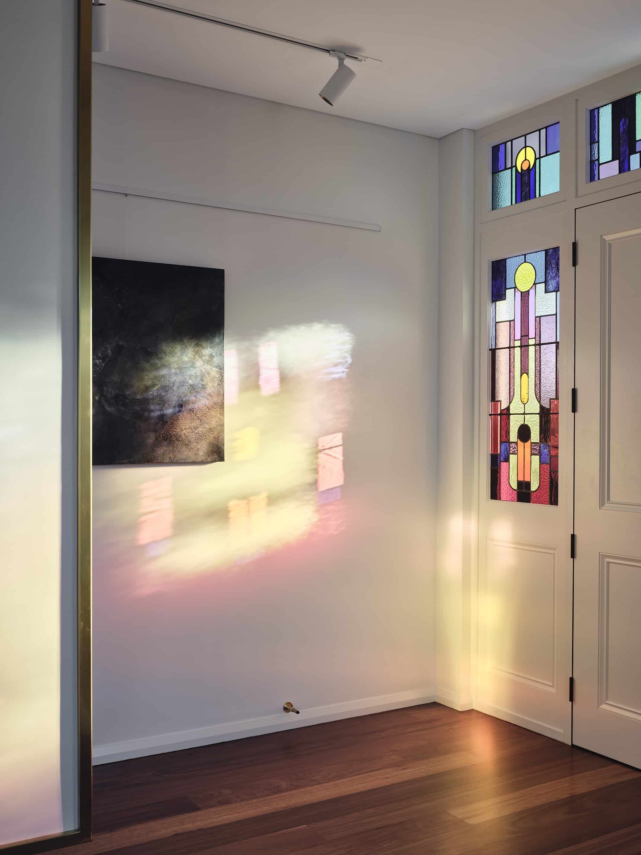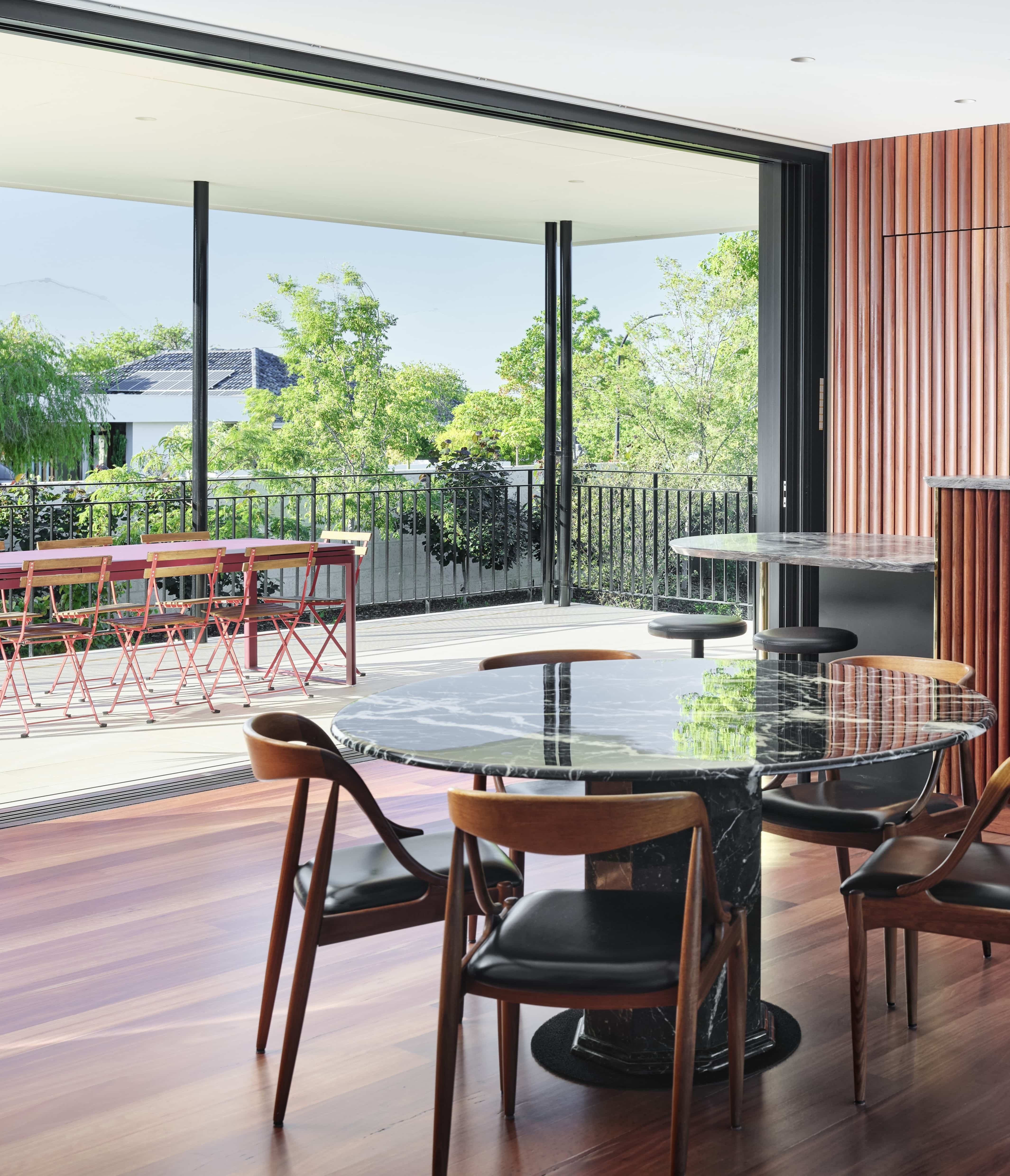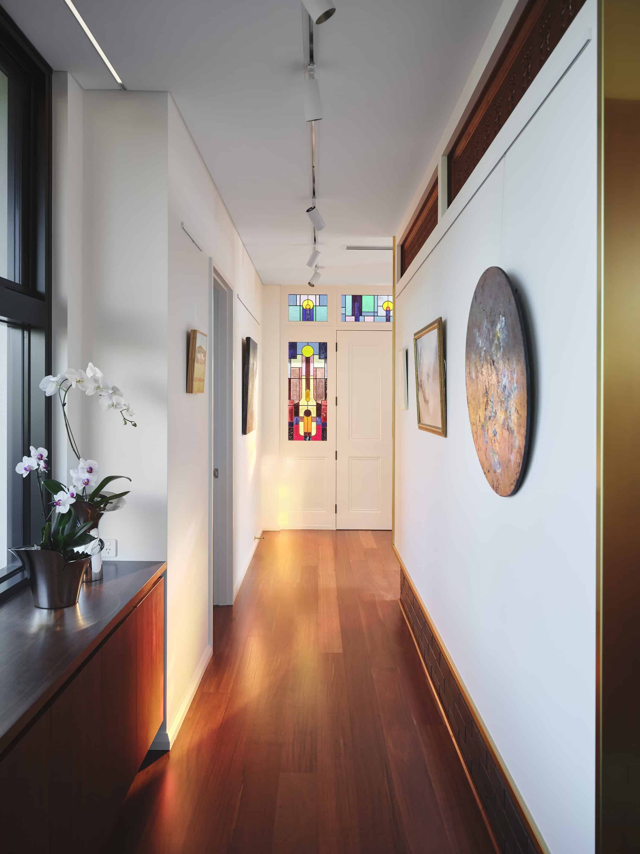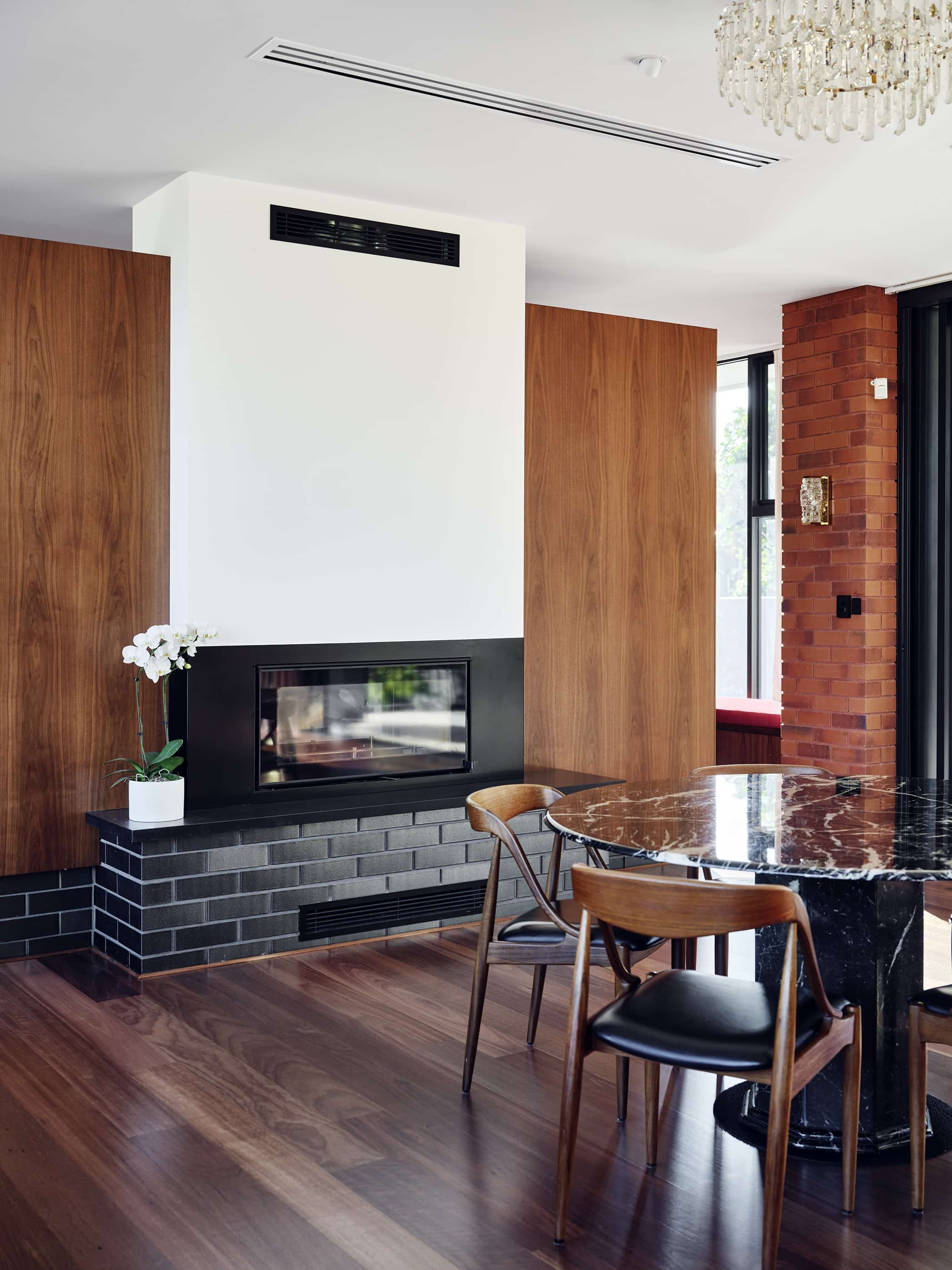 A restrained palette of timber, masonry, stone and glass establishes spatial clarity and supports a gallery-like approach to living, where art, daylight, and the subtle luminosity of brass accents are integral to the architectural experience. With large scale windows overlooking the garden the connection to the sky, clouds and beautiful surrounding tree canopy can be appreciated from spaces throughout the home. The house balances openness with shelter to create a calm, composed domestic environment responsive to climate and context, celebrating warm materiality and texture in a grand yet homely manner.