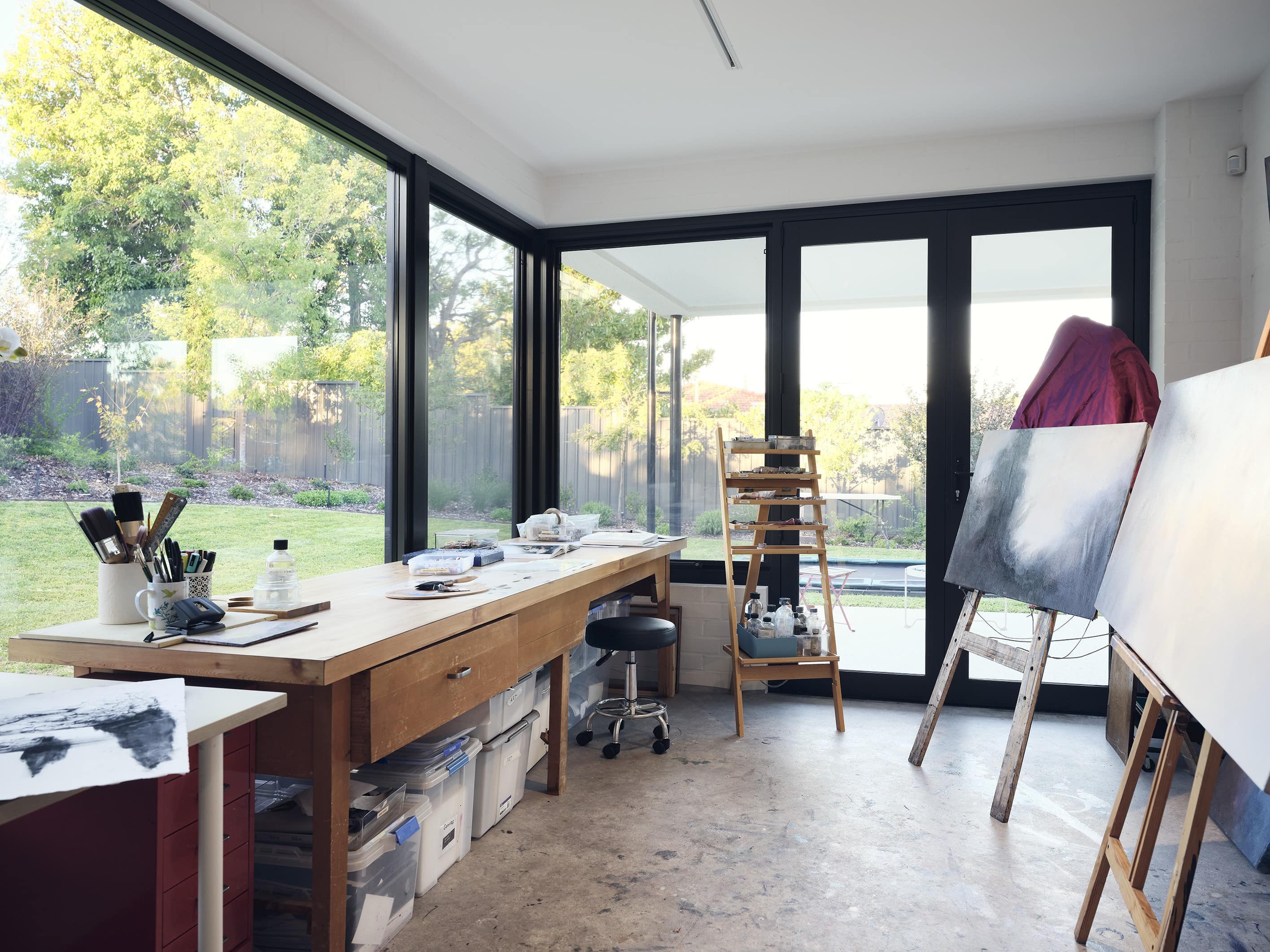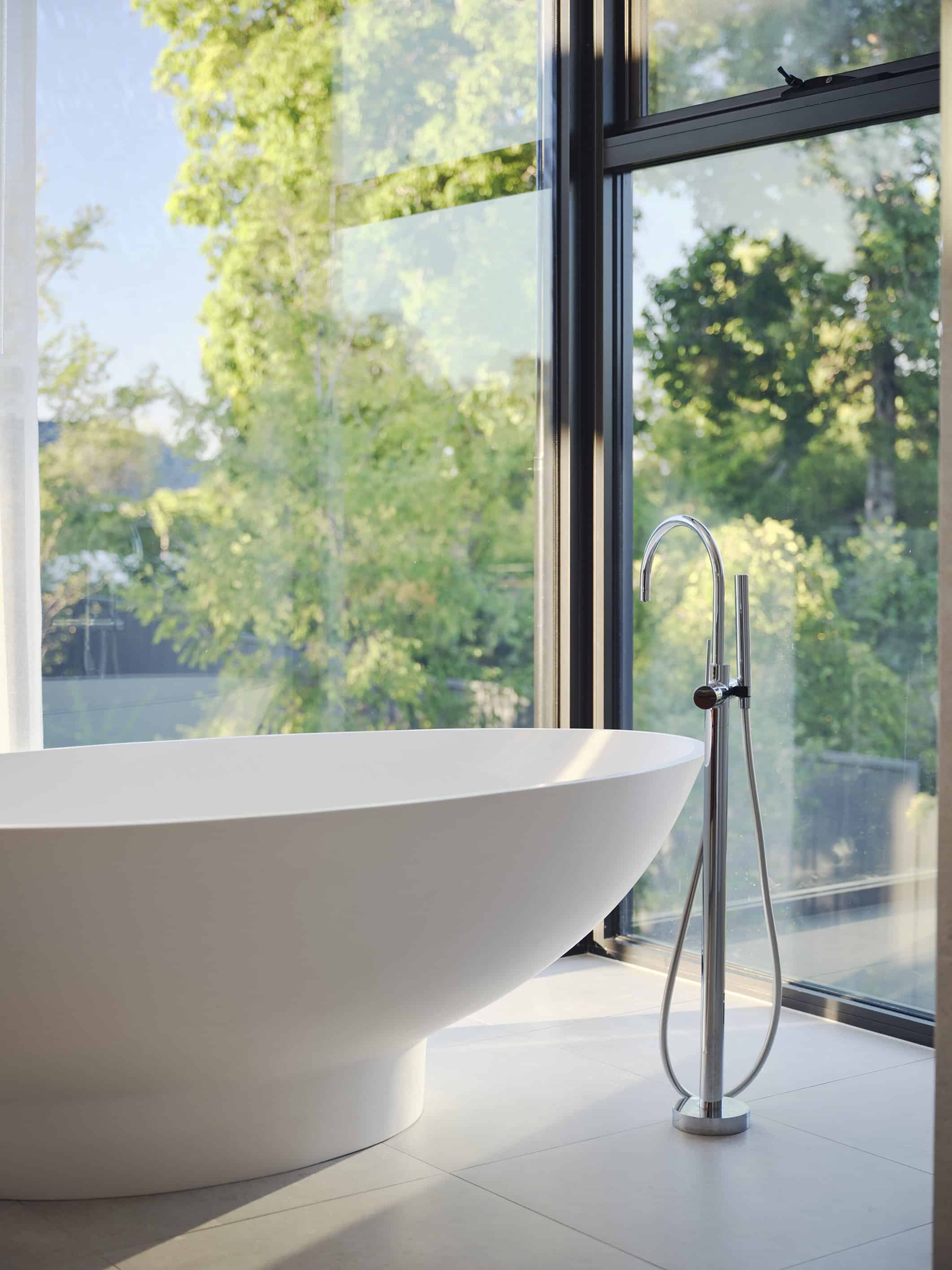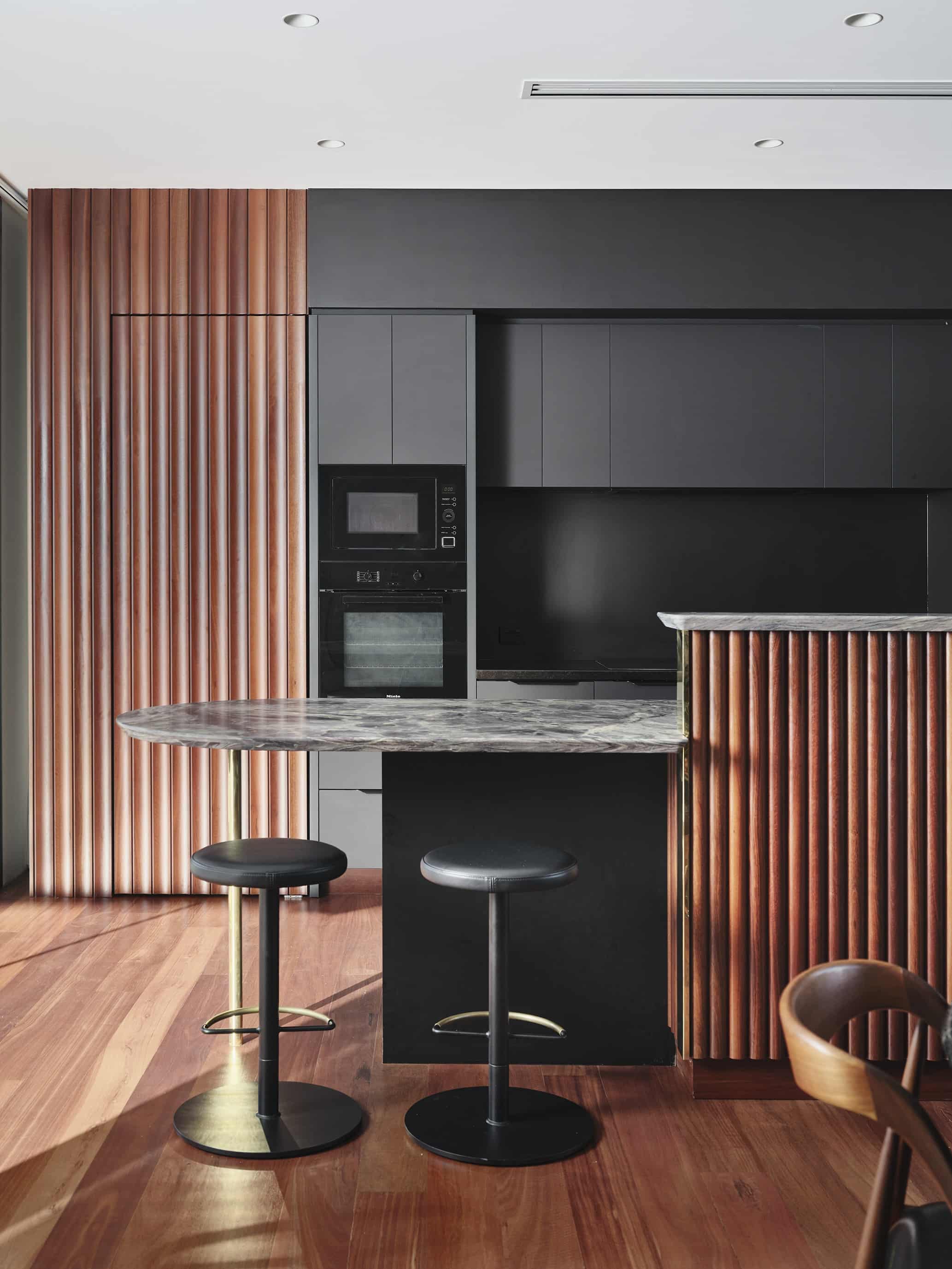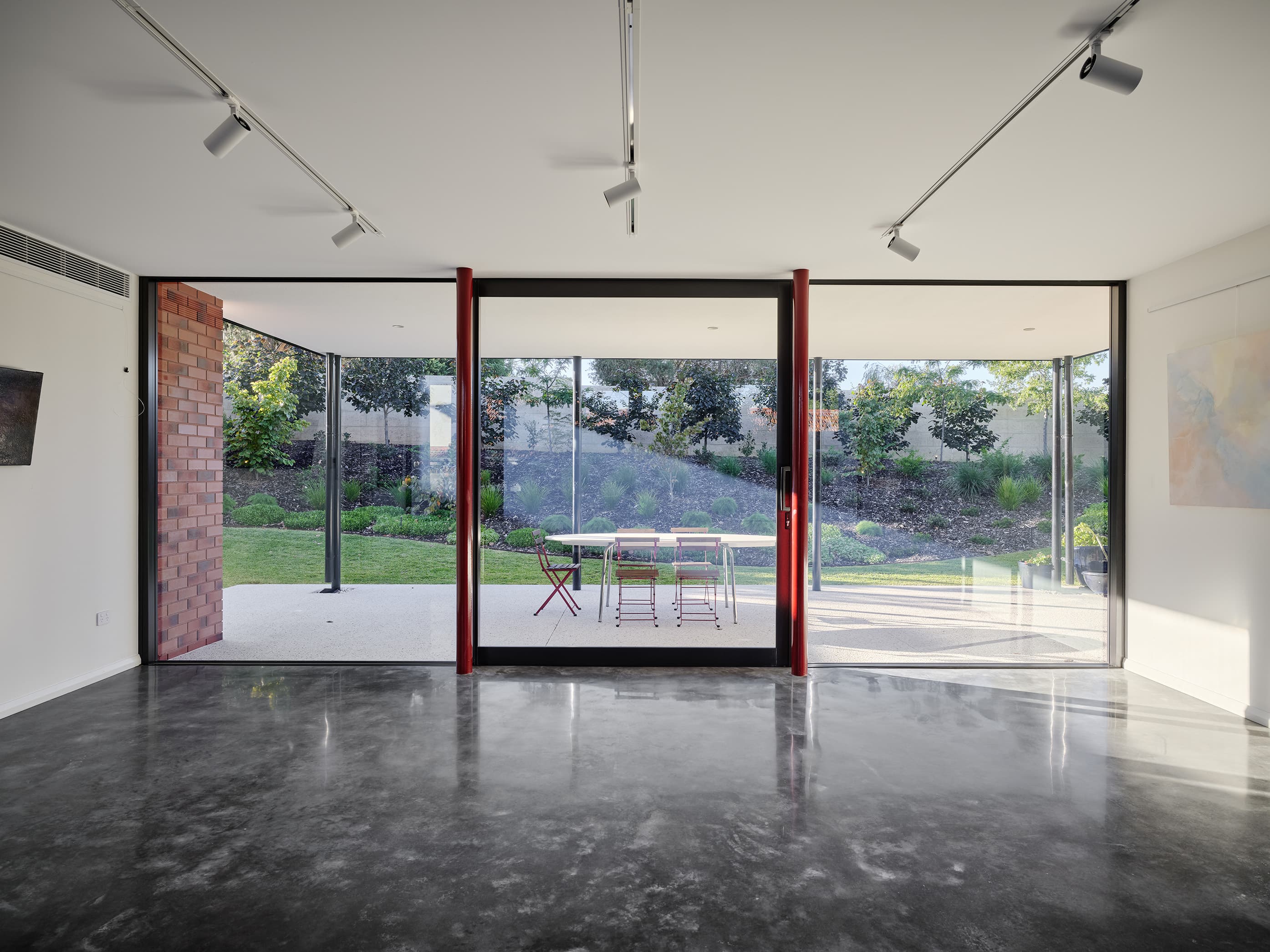 A restrained palette of timber, masonry, stone and glass establishes spatial clarity and supports a gallery-like approach to living, where art, daylight, and the subtle luminosity of brass accents are integral to the architectural experience. With large scale windows overlooking the garden the connection to the sky, clouds and beautiful surrounding tree canopy can be appreciated from spaces throughout the home. The house balances openness with shelter to create a calm, composed domestic environment responsive to climate and context, celebrating warm materiality and texture in a grand yet homely manner.