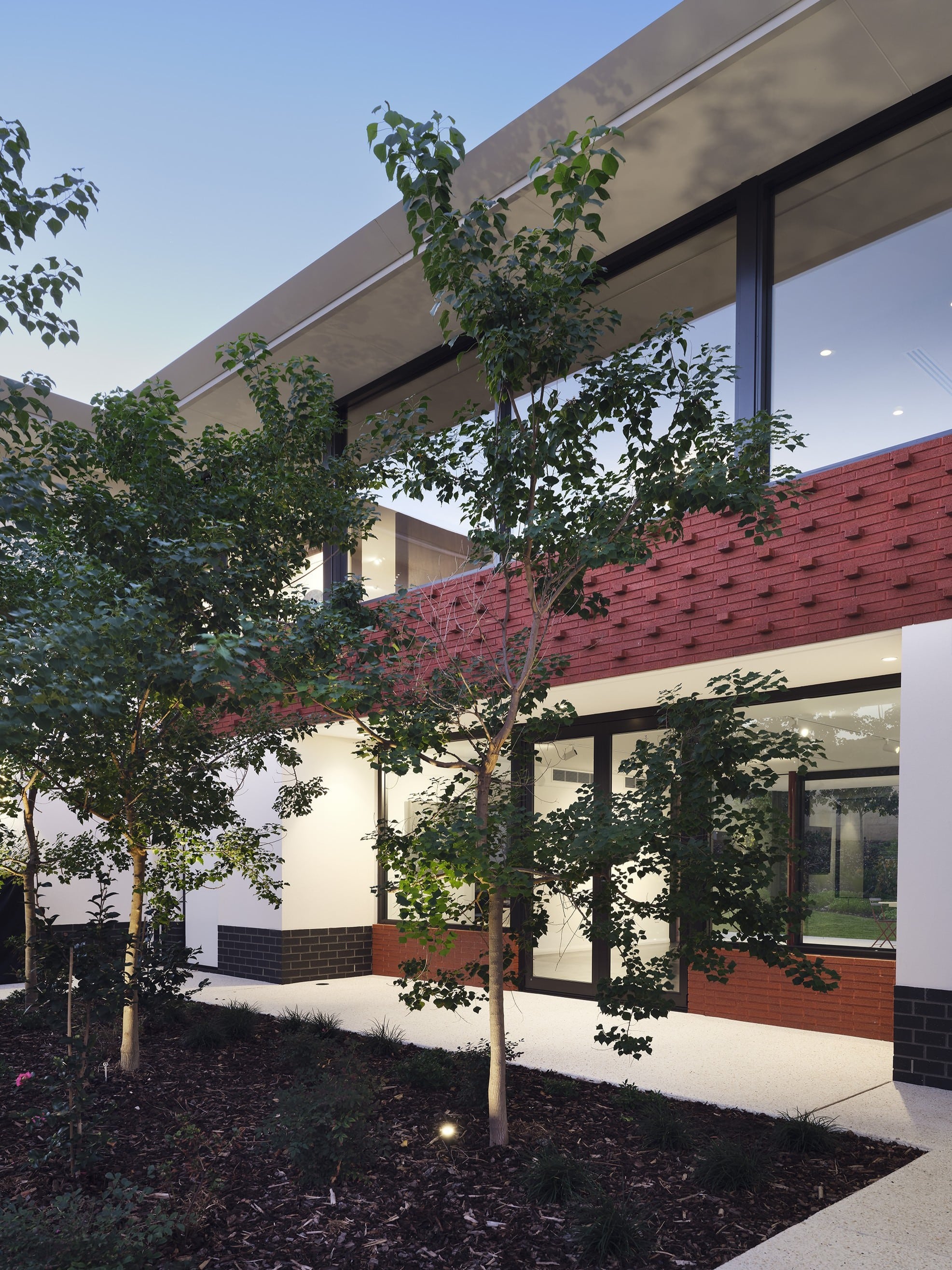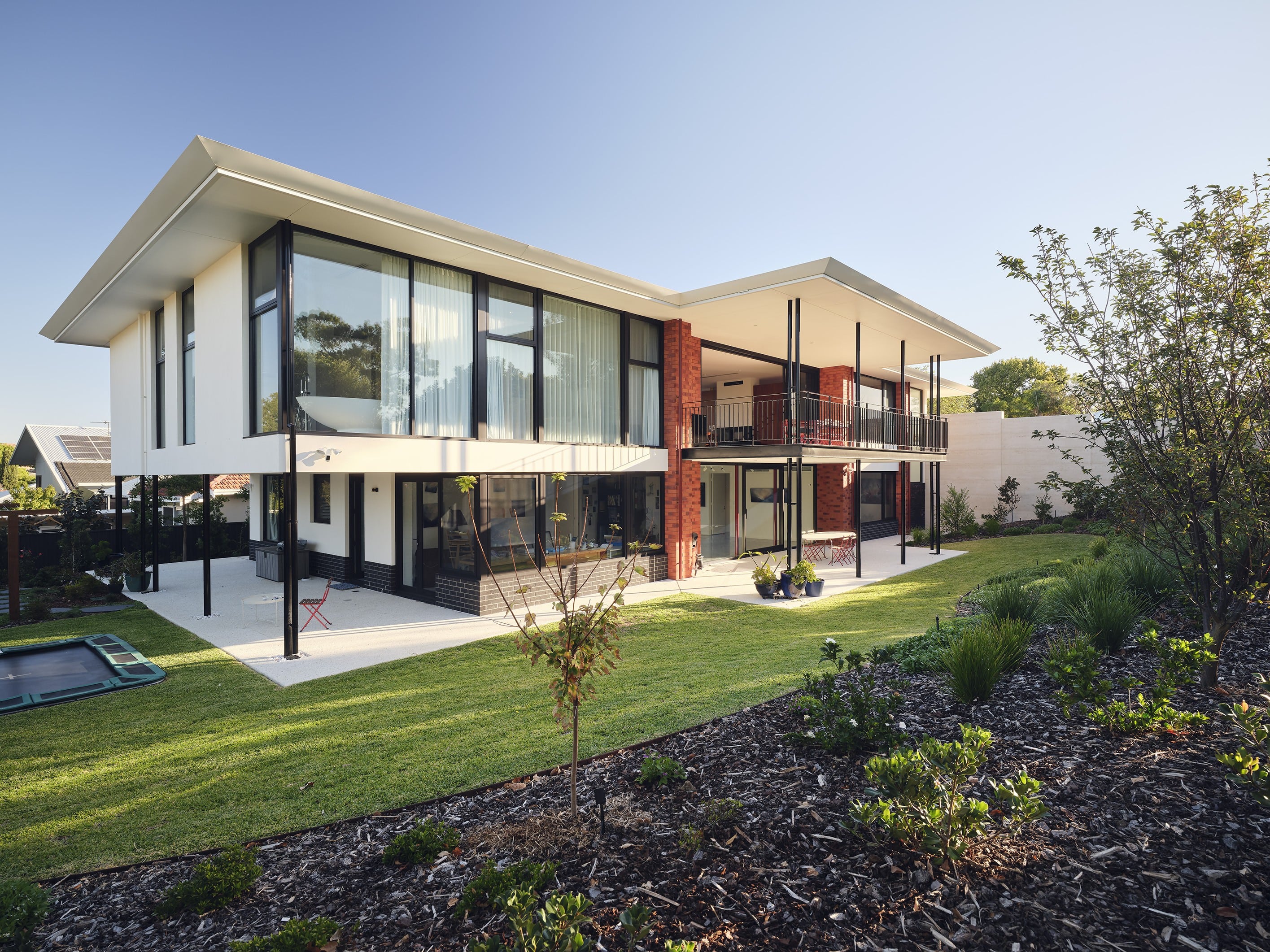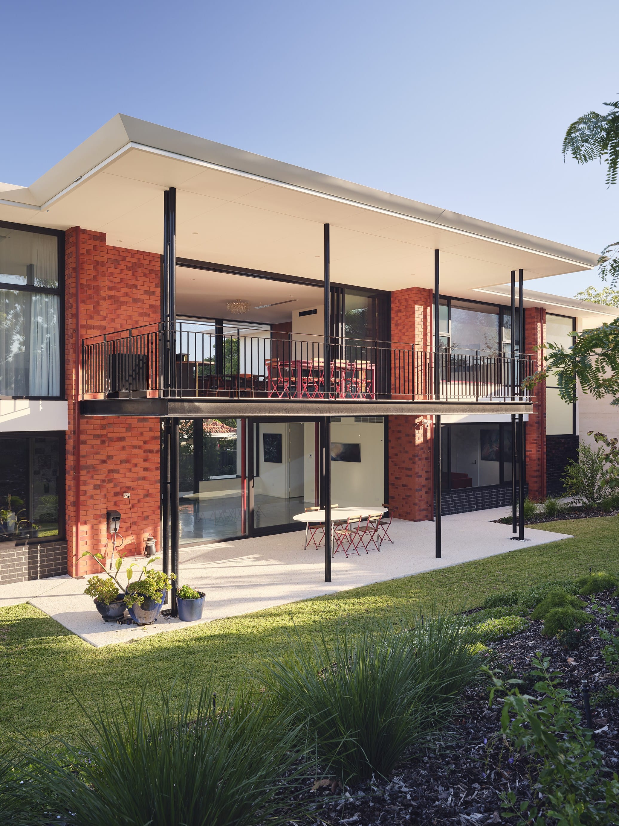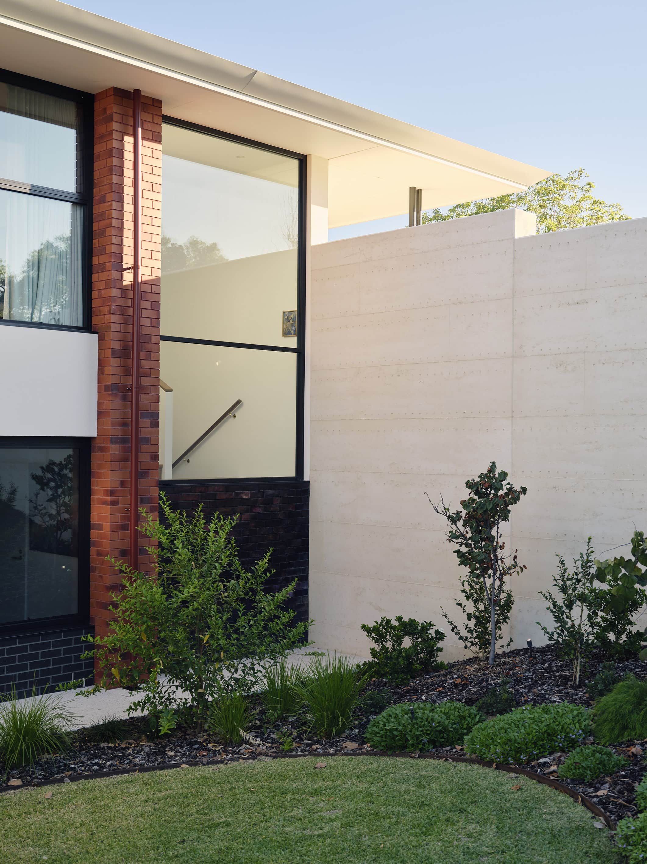 A stunning symbiosis of architecture and landscape, Light Pavilion is a residence shaped by light and connection to nature. The architecture is structured around broad horizontal roof planes, deep eaves, and precisely framed openings that regulate daylight and maintain a continuous relationship between interior spaces and their surroundings. Material mass and lightness are held in deliberate balance: brick piers and a rammed earth wall provide grounded weight, while slender columns, refined roof edges, and expansive glazing temper the building’s perceived solidity.