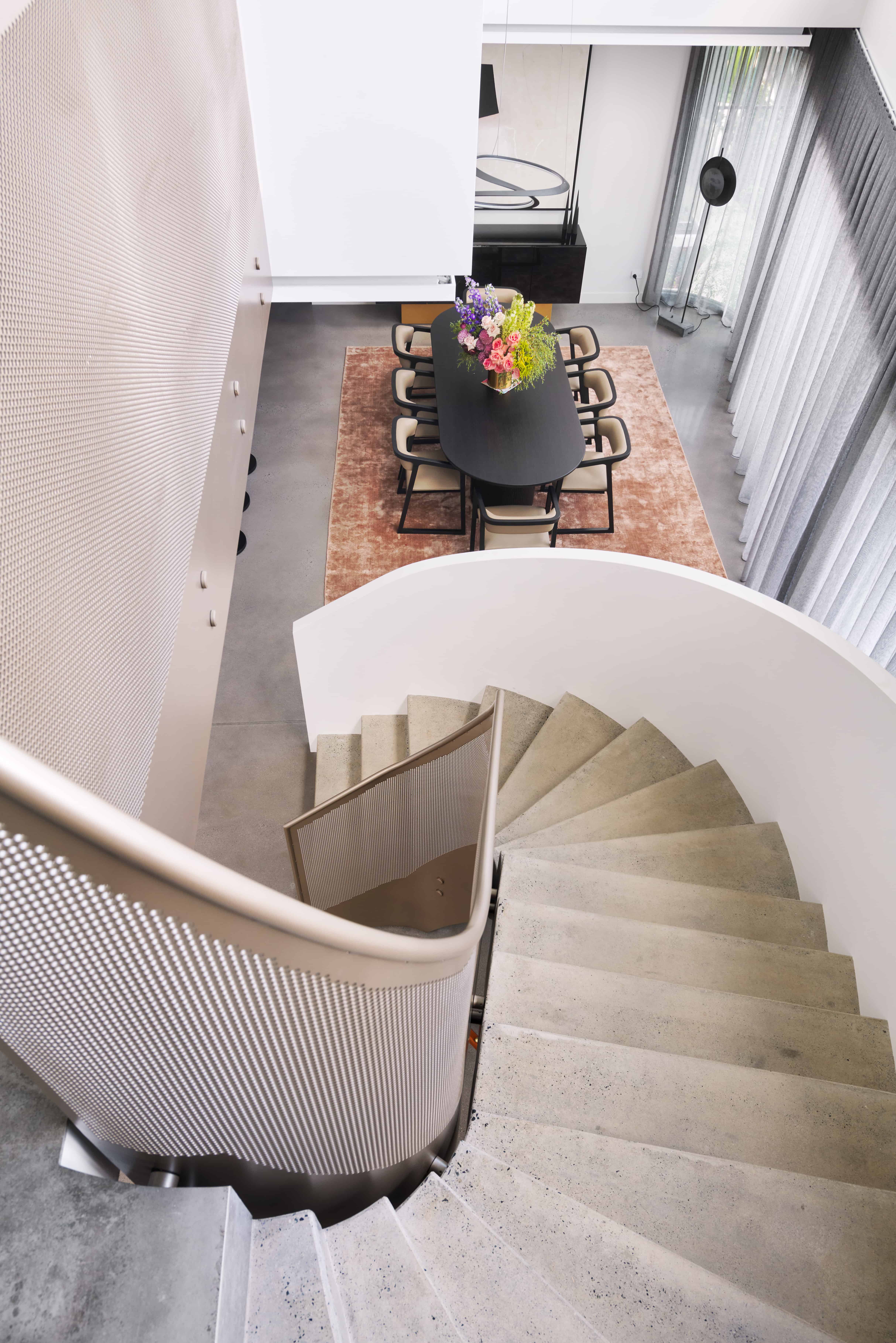 A defining feature is the sweeping elongated staircase, detailed with perforated metal balustrades and polished concrete treads, balanced by crisp white balustrades to the opposite side, adding sculptural contrast and architectural clarity.