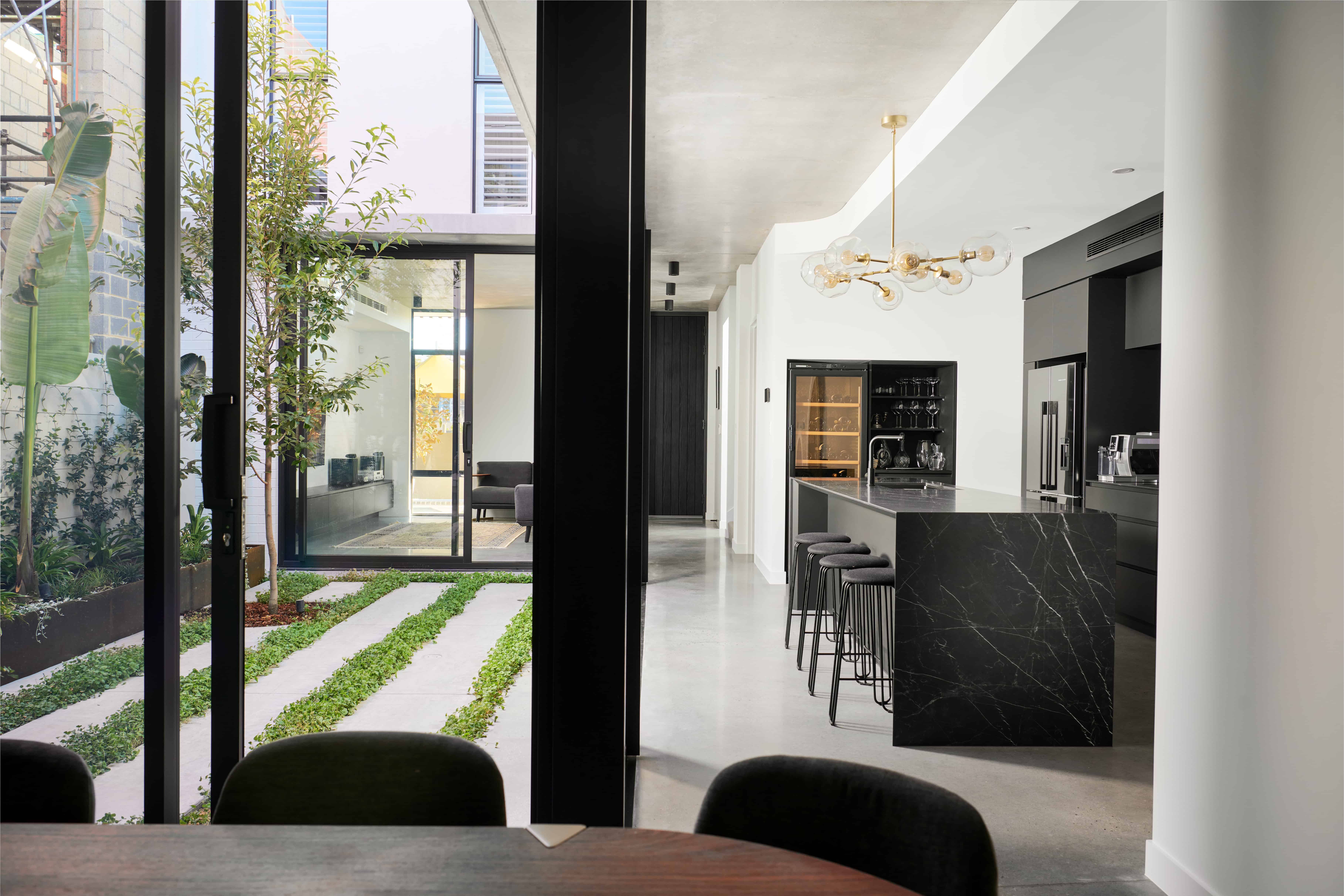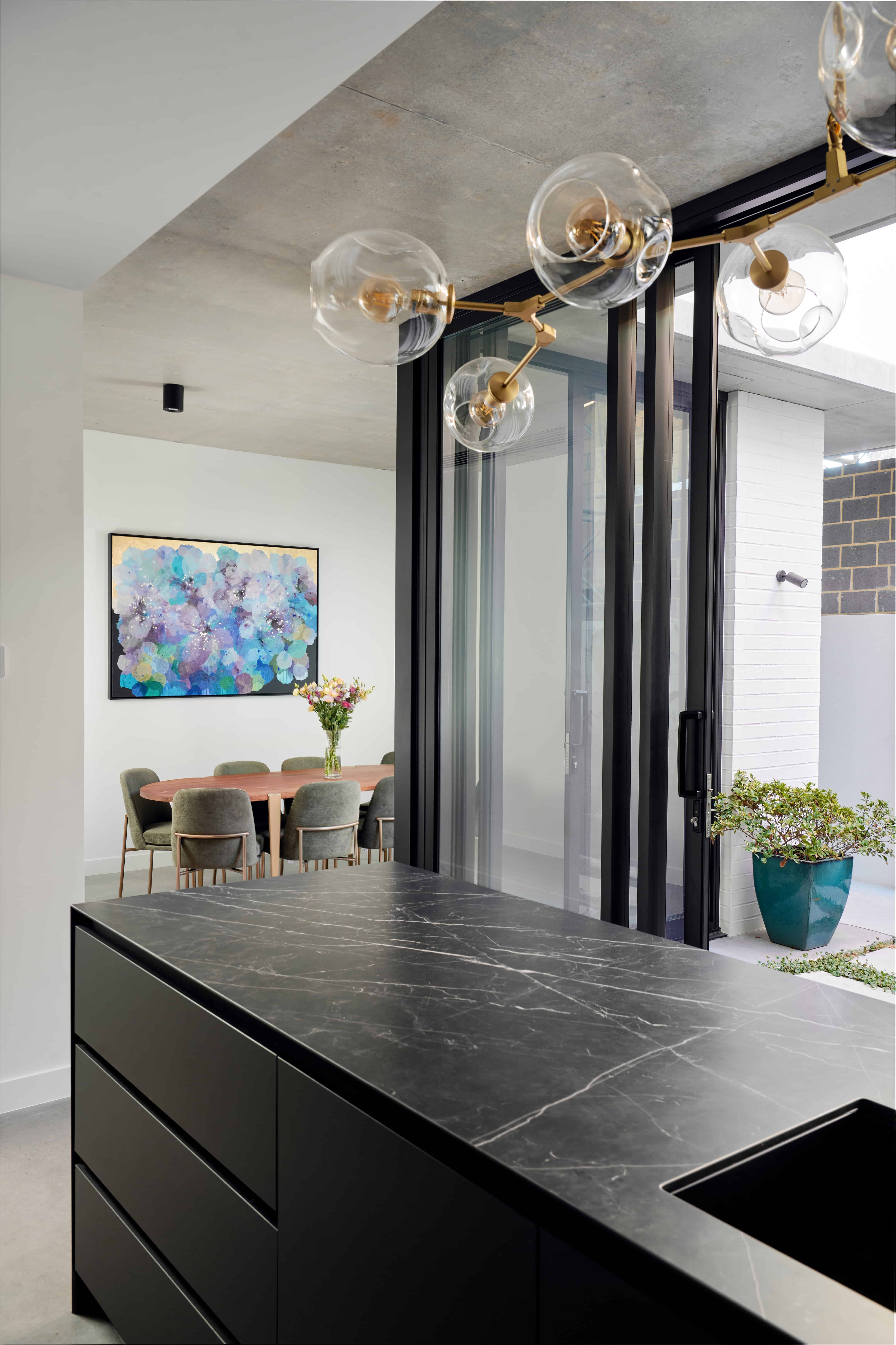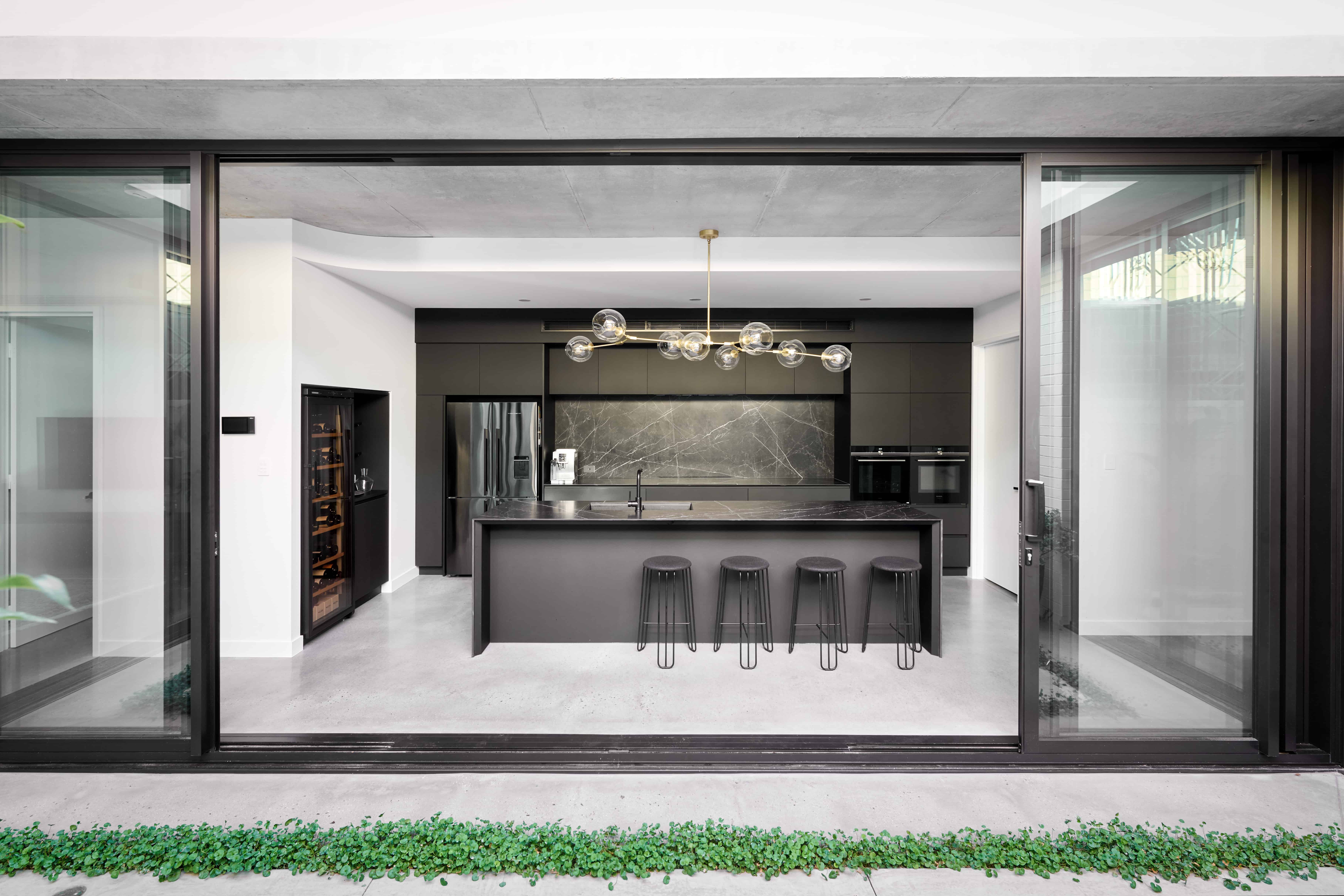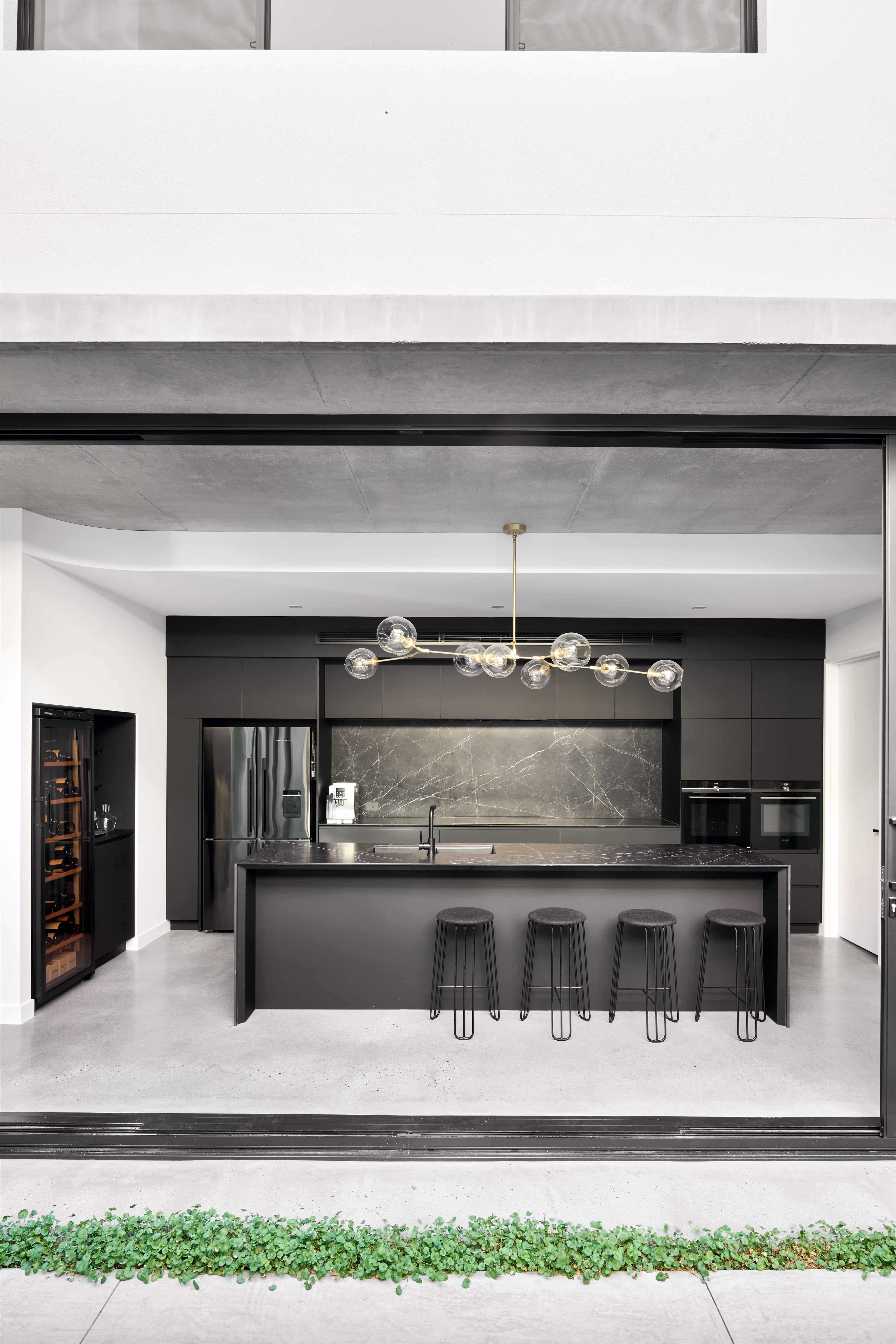 The raw, bold material palette of off-form concrete ceilings and dark cabinetry anchors the home, while considered design strategies including a 7-star energy rating, solar panels, electric heat pump and passive solar principles support natural ventilation and year-round comfort.
