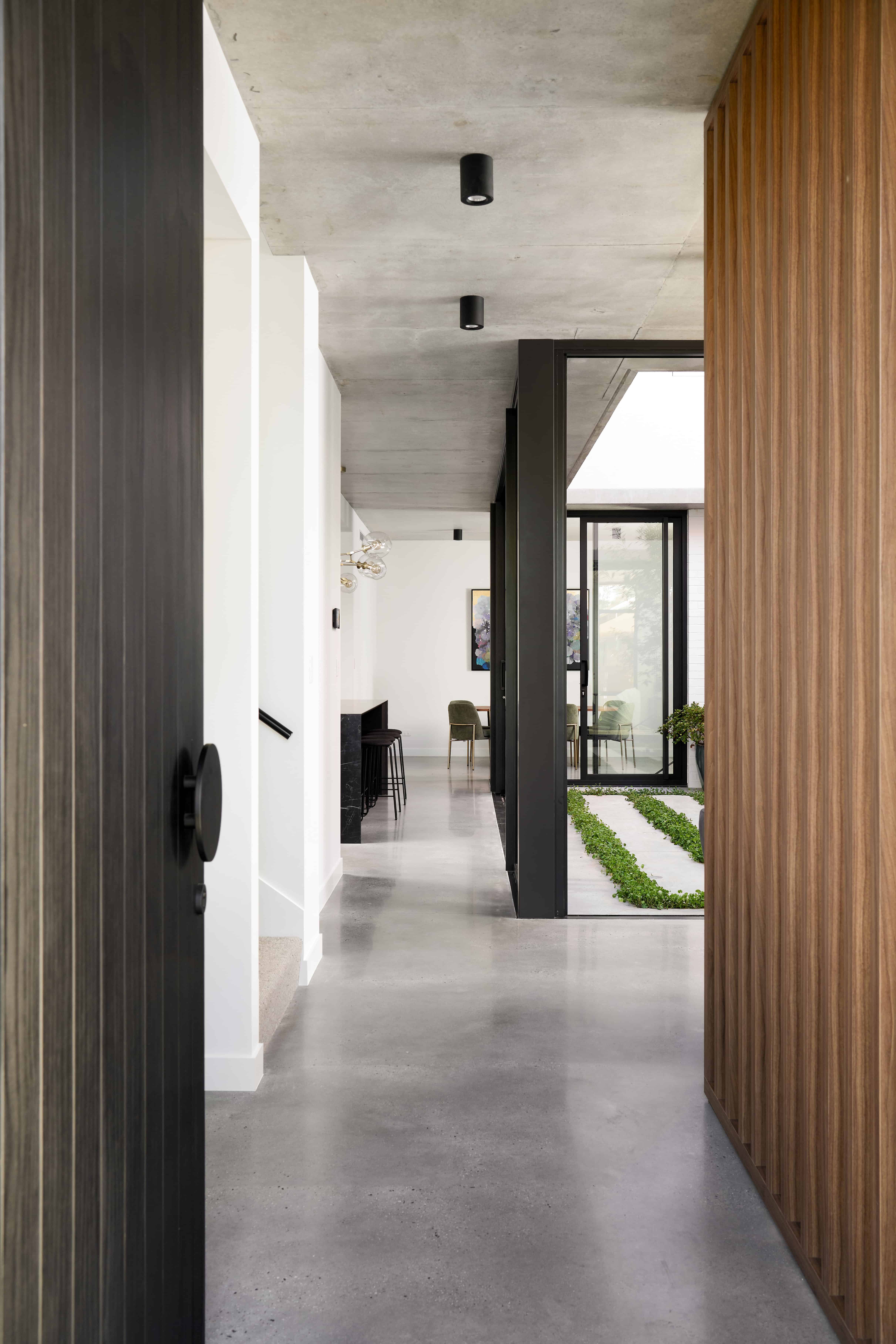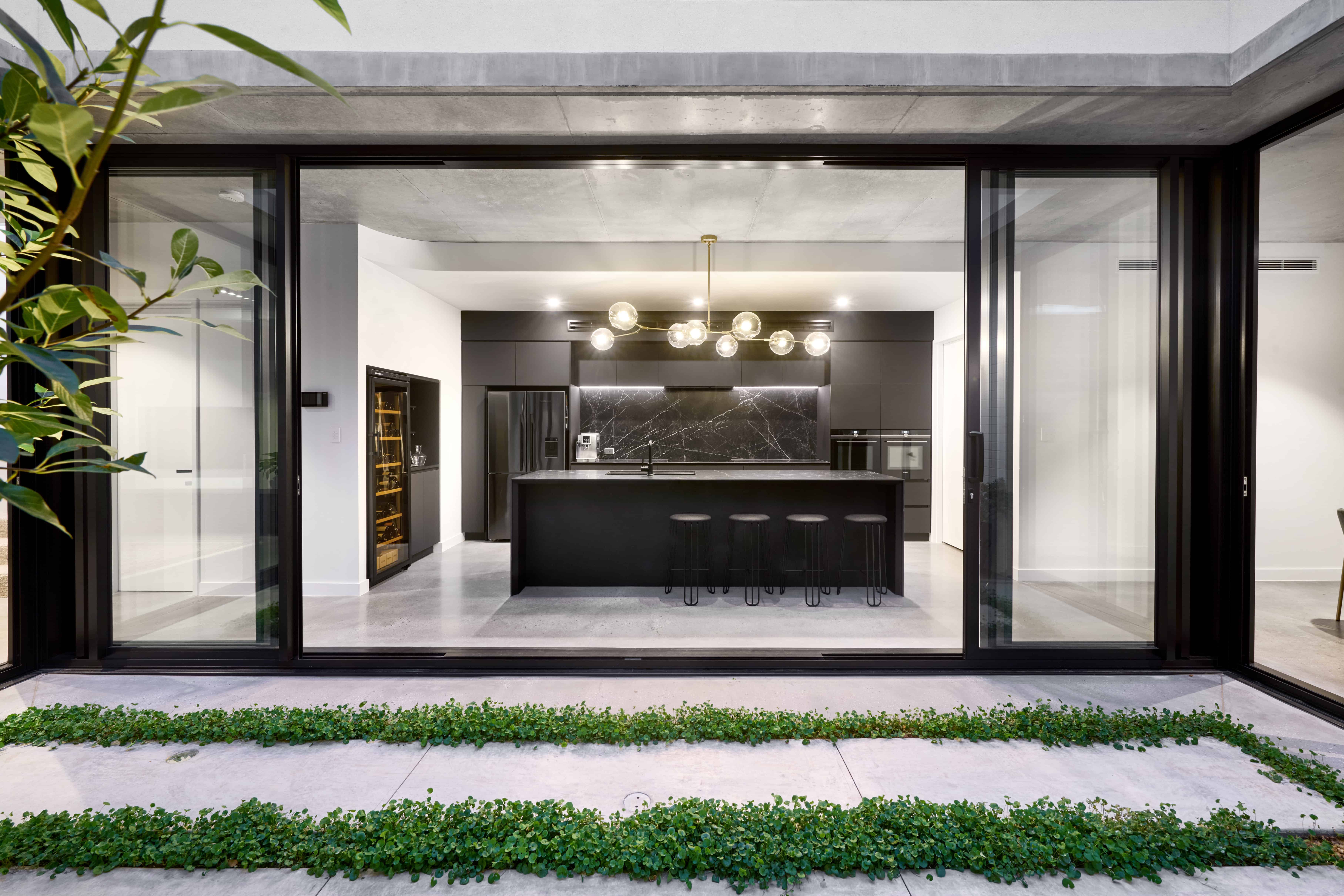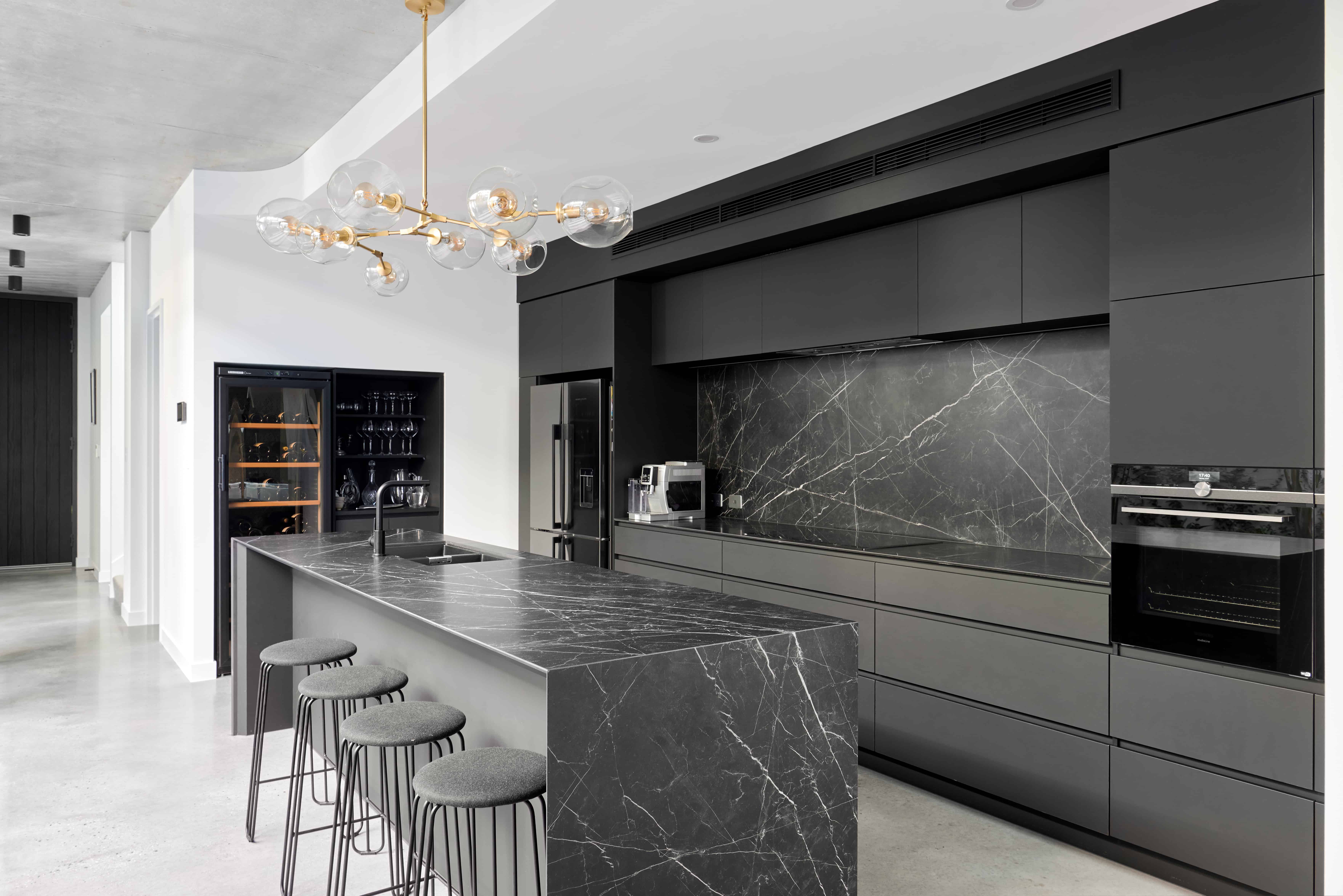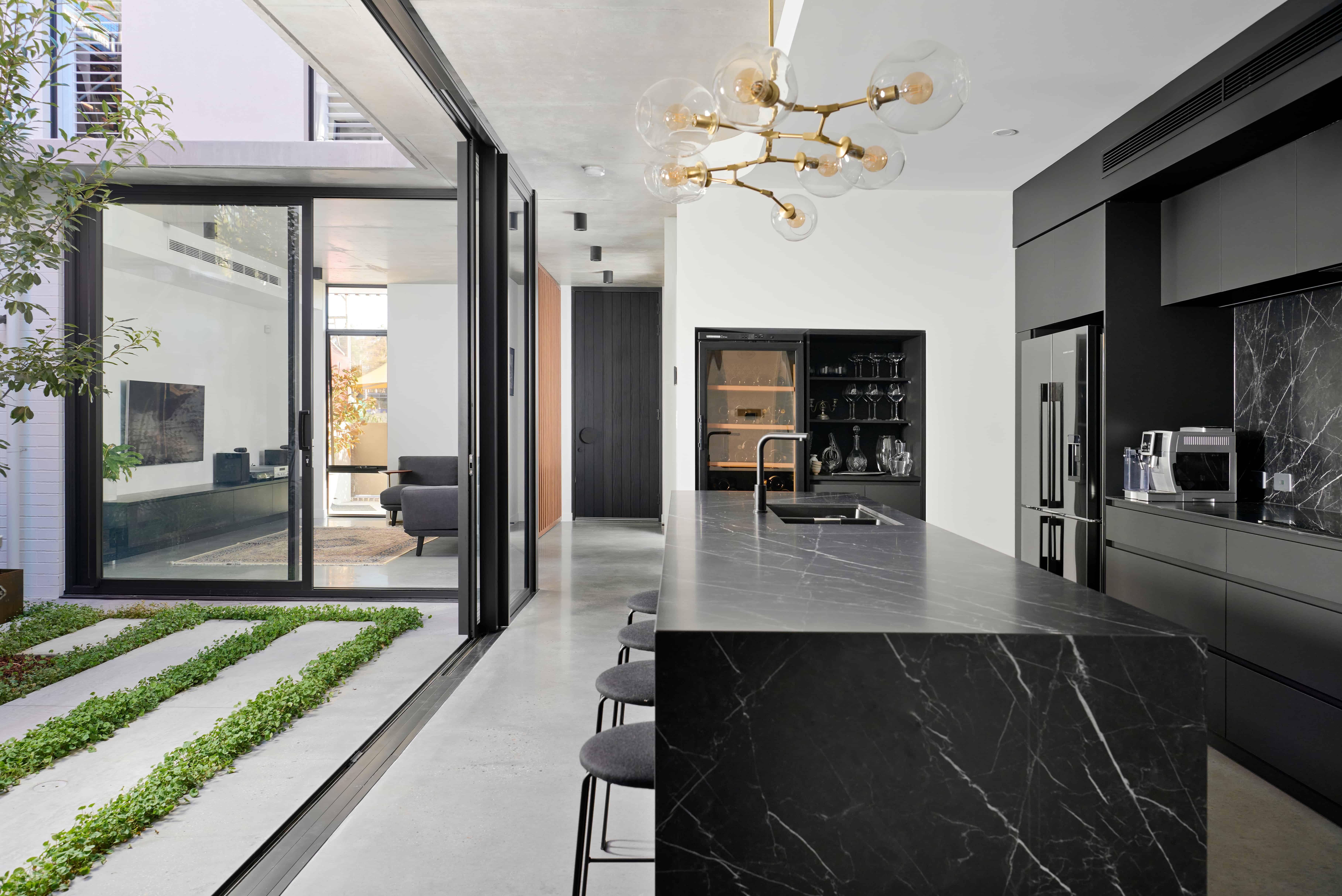 The raw, bold material palette of off-form concrete ceilings and dark cabinetry anchors the home, while considered design strategies including a 7-star energy rating, solar panels, electric heat pump and passive solar principles support natural ventilation and year-round comfort.