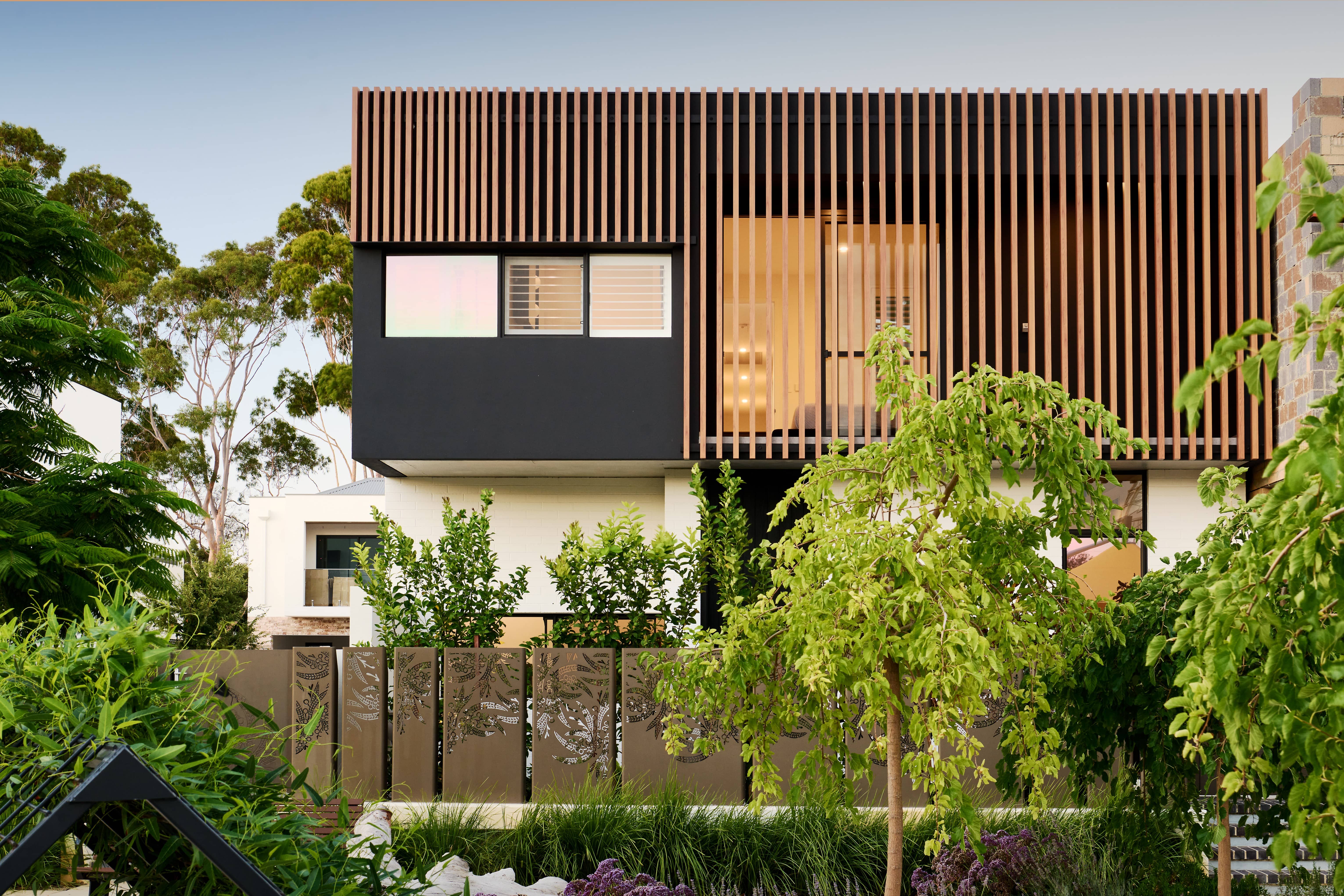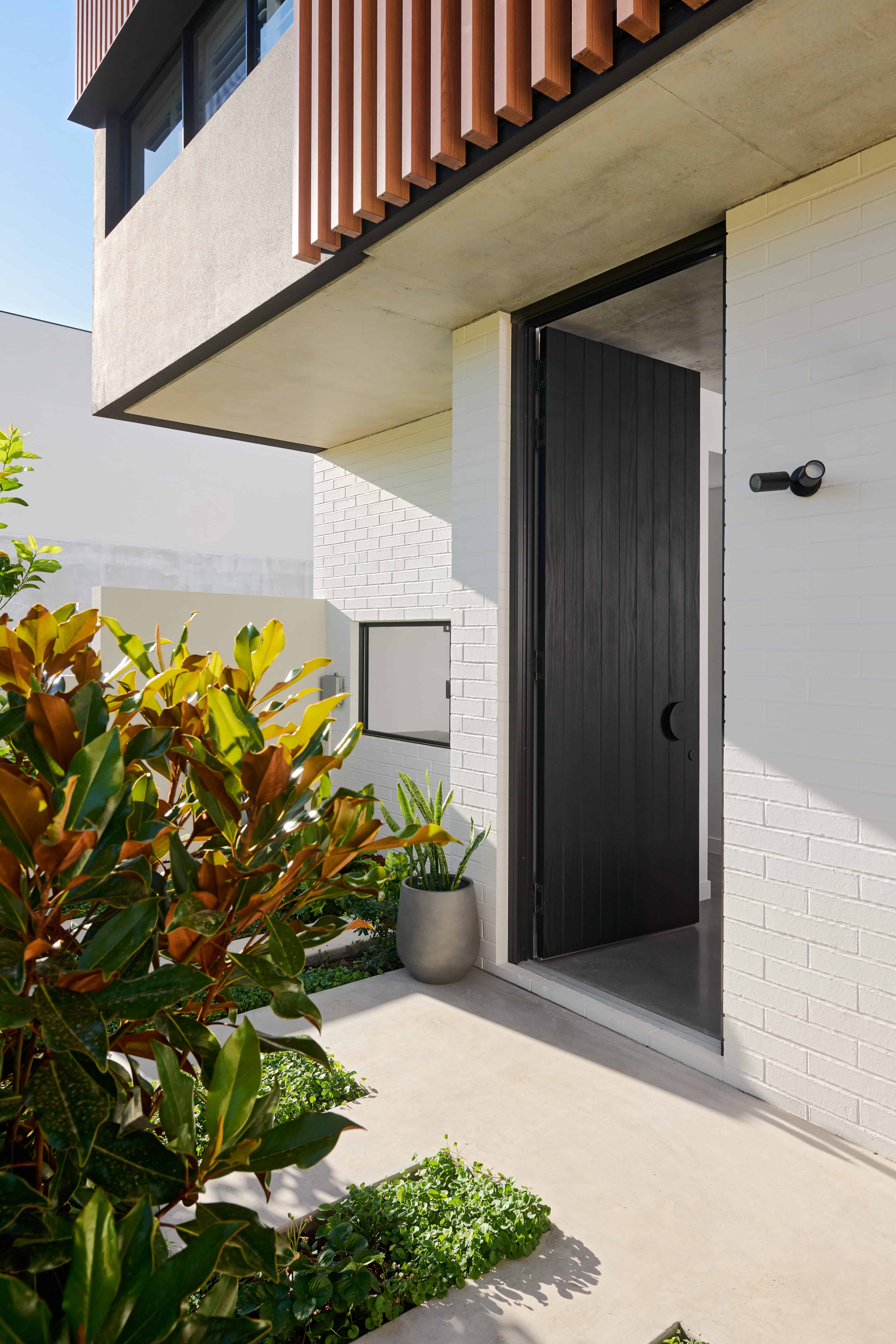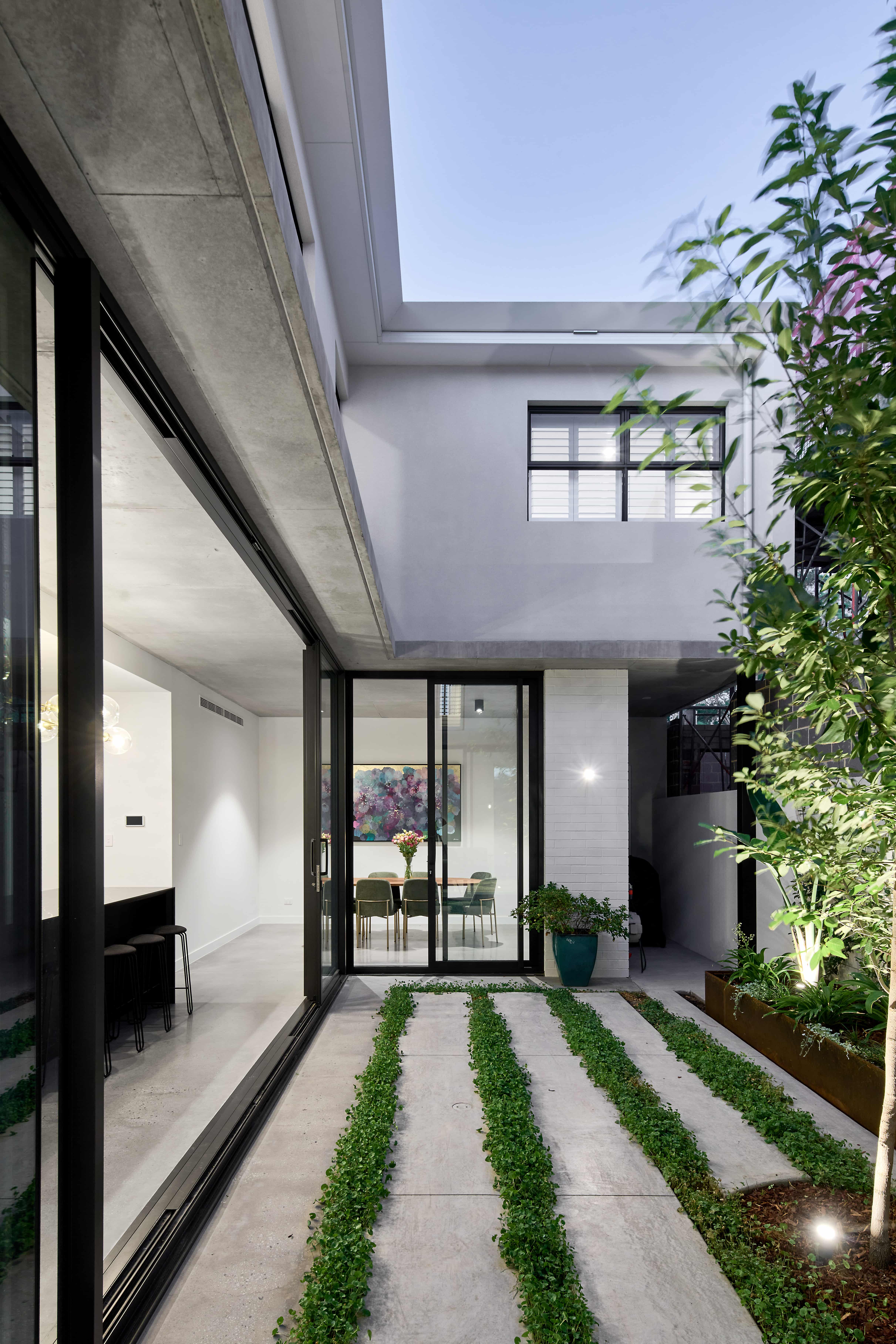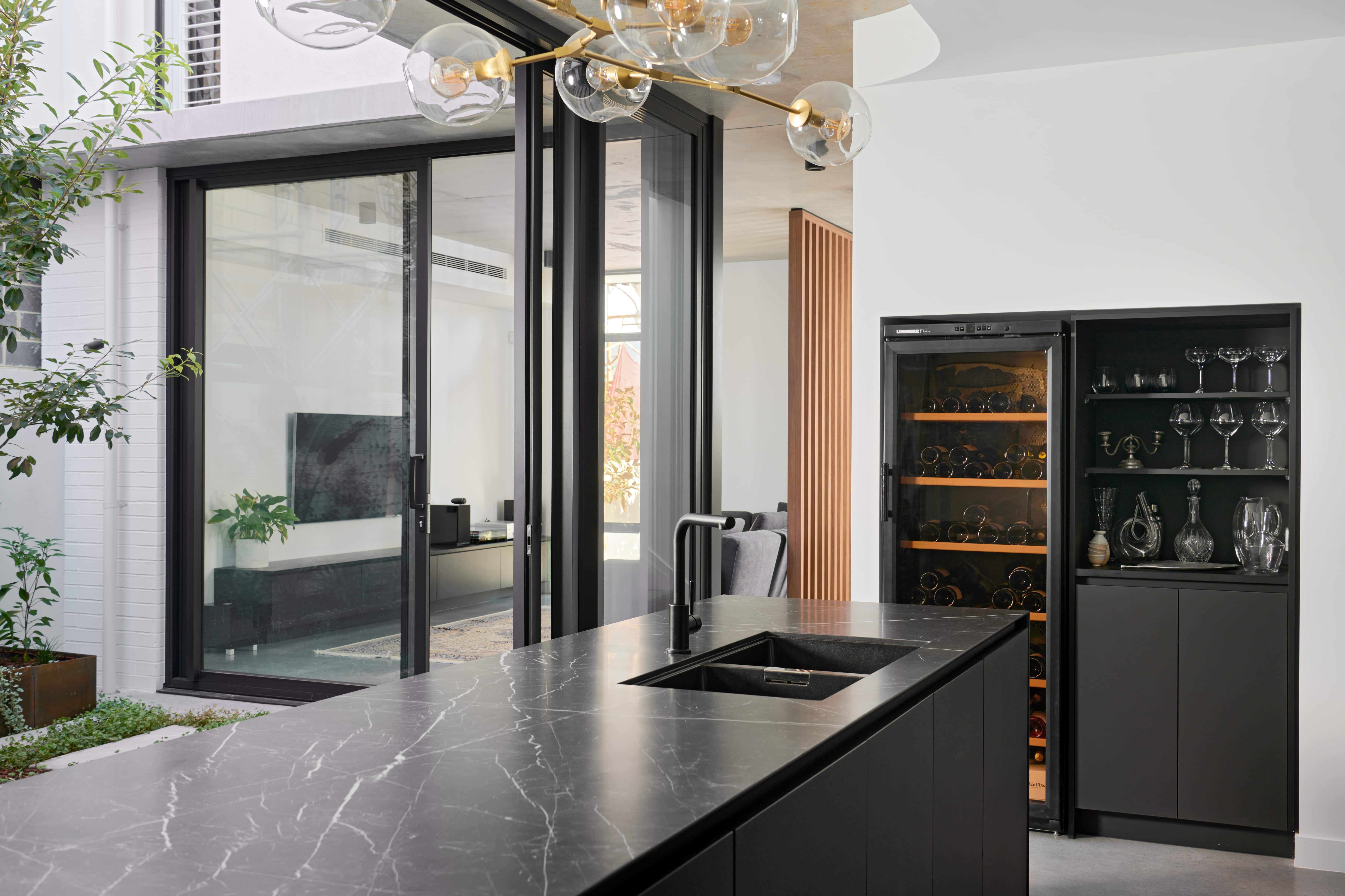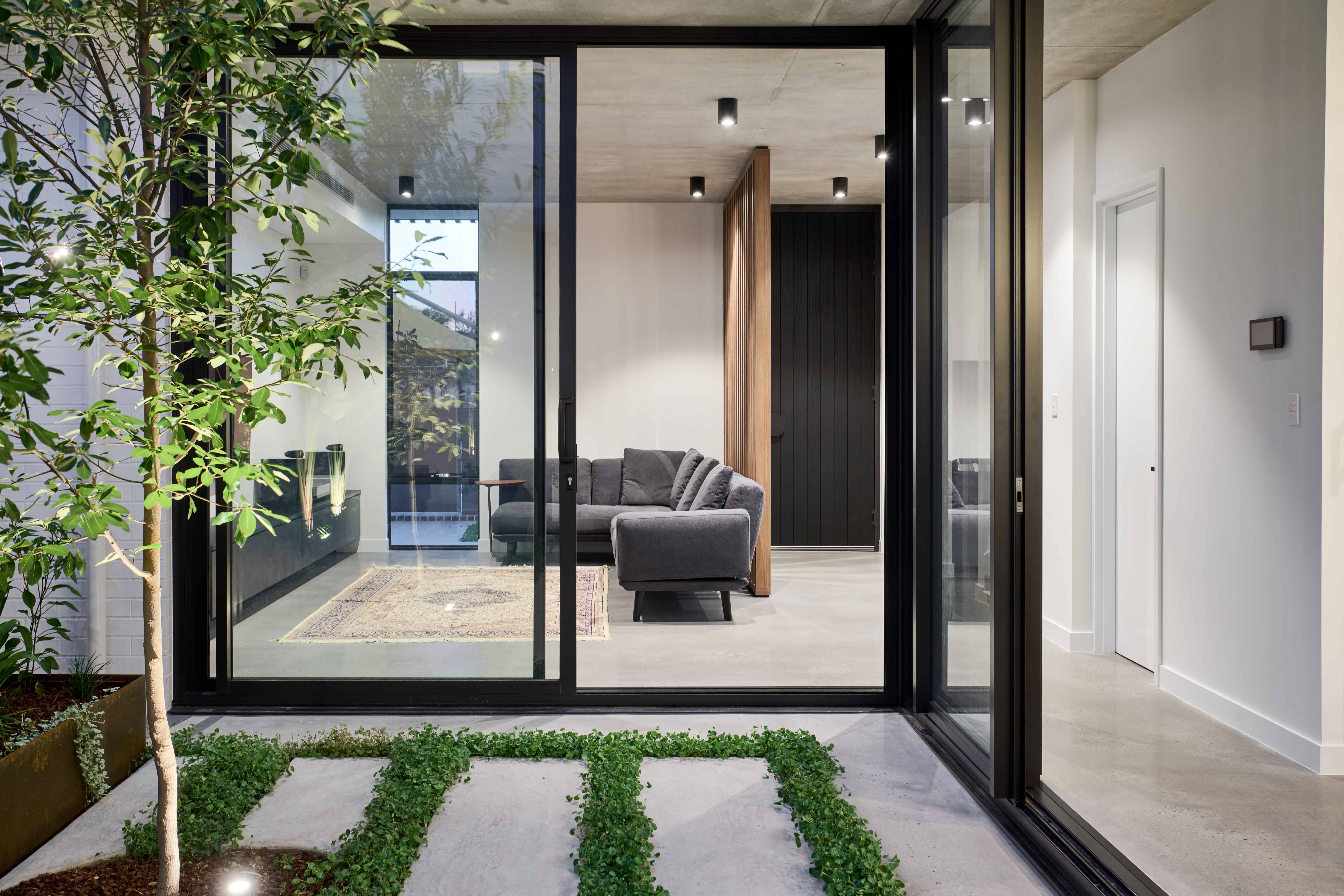 The raw, bold material palette of off-form concrete ceilings and dark cabinetry anchors the home, while considered design strategies including a 7-star energy rating, solar panels, electric heat pump and passive solar principles support natural ventilation and year-round comfort.