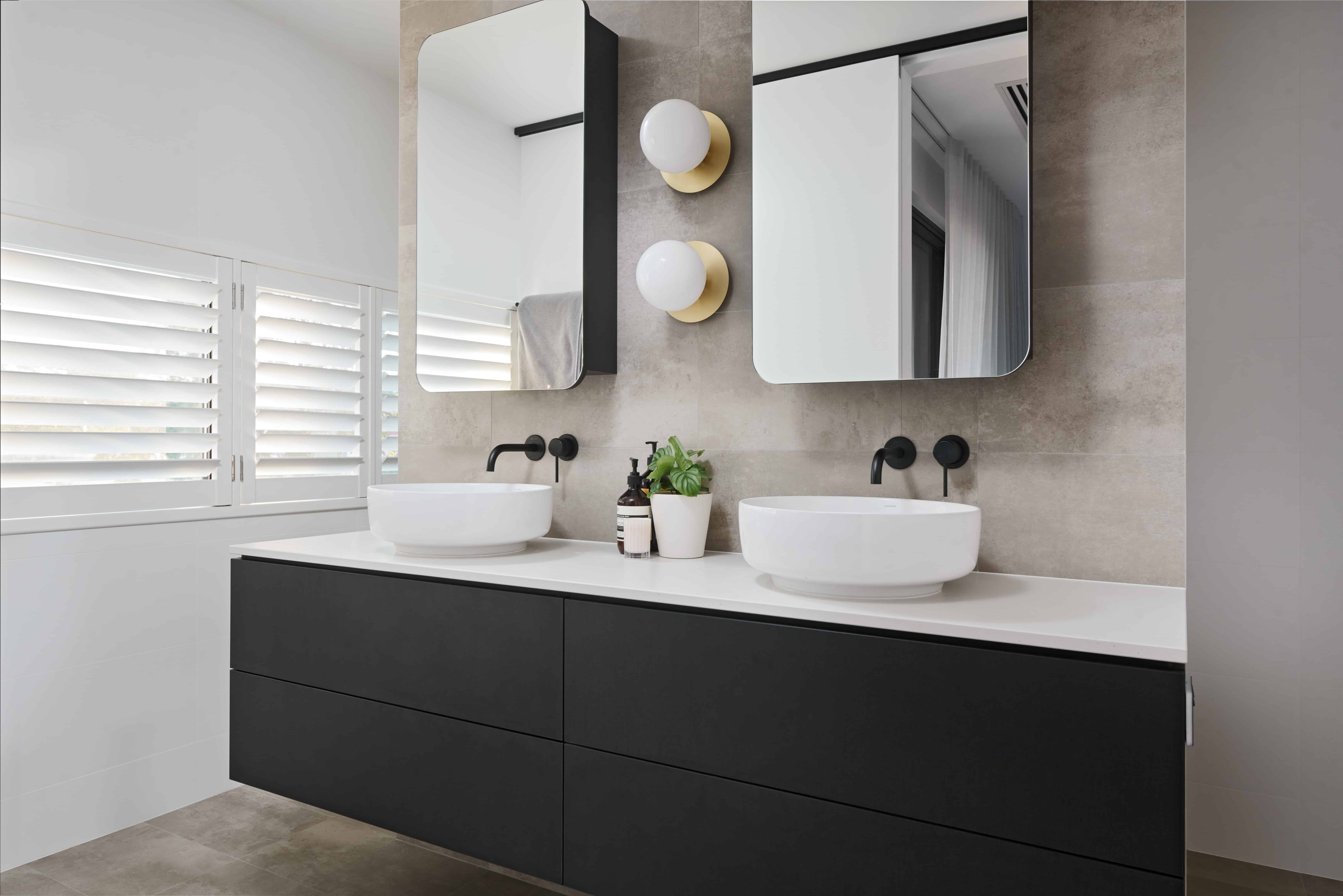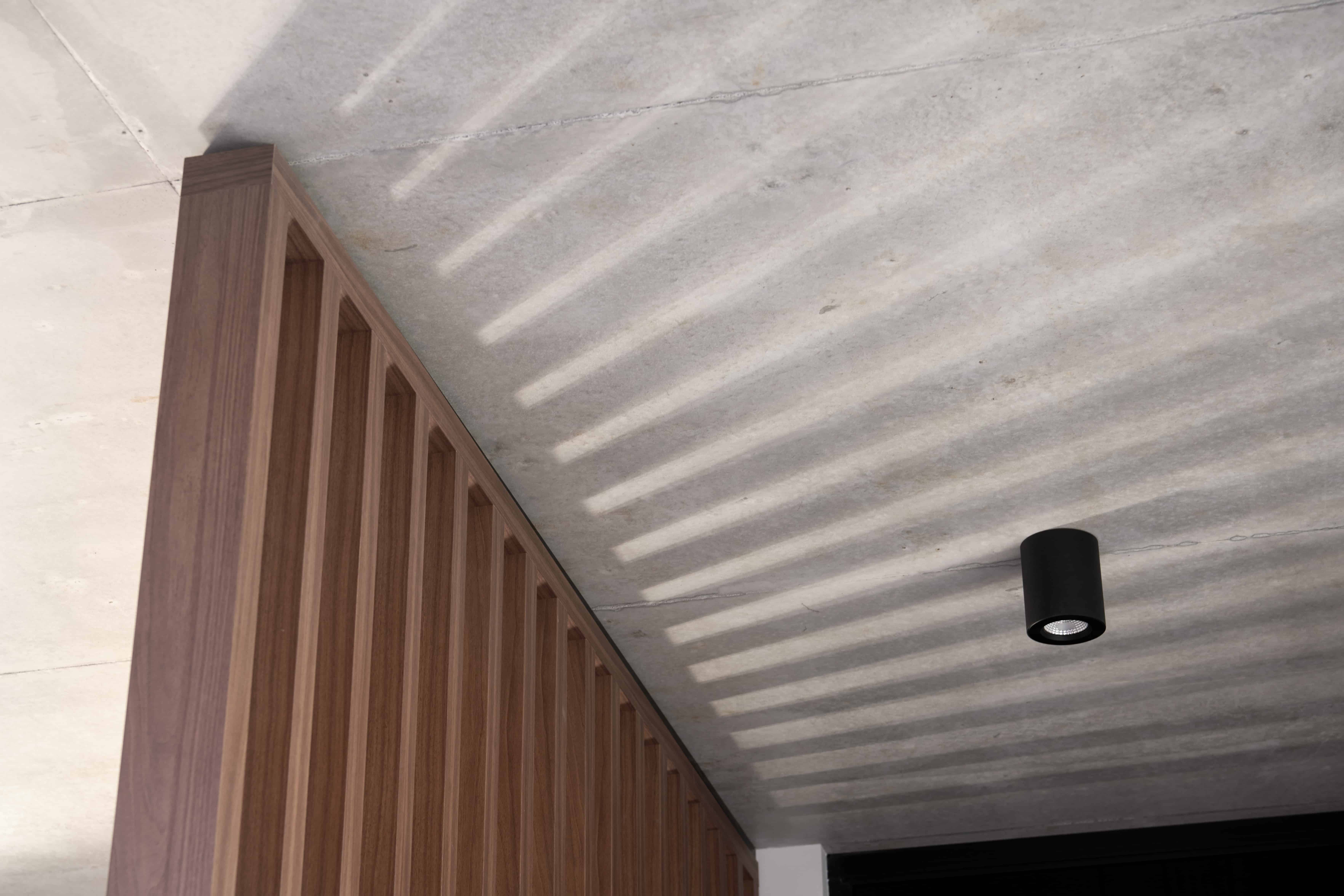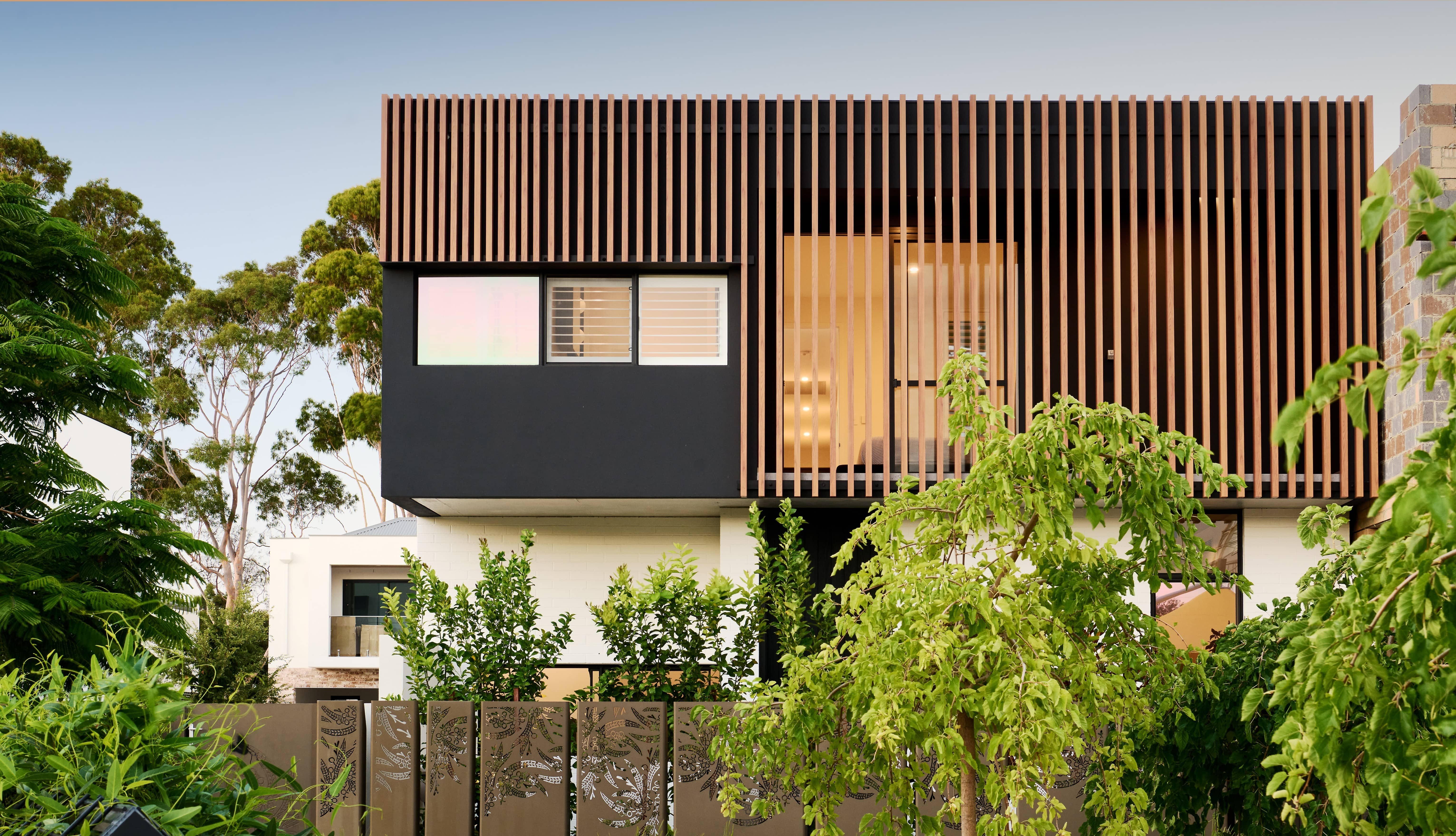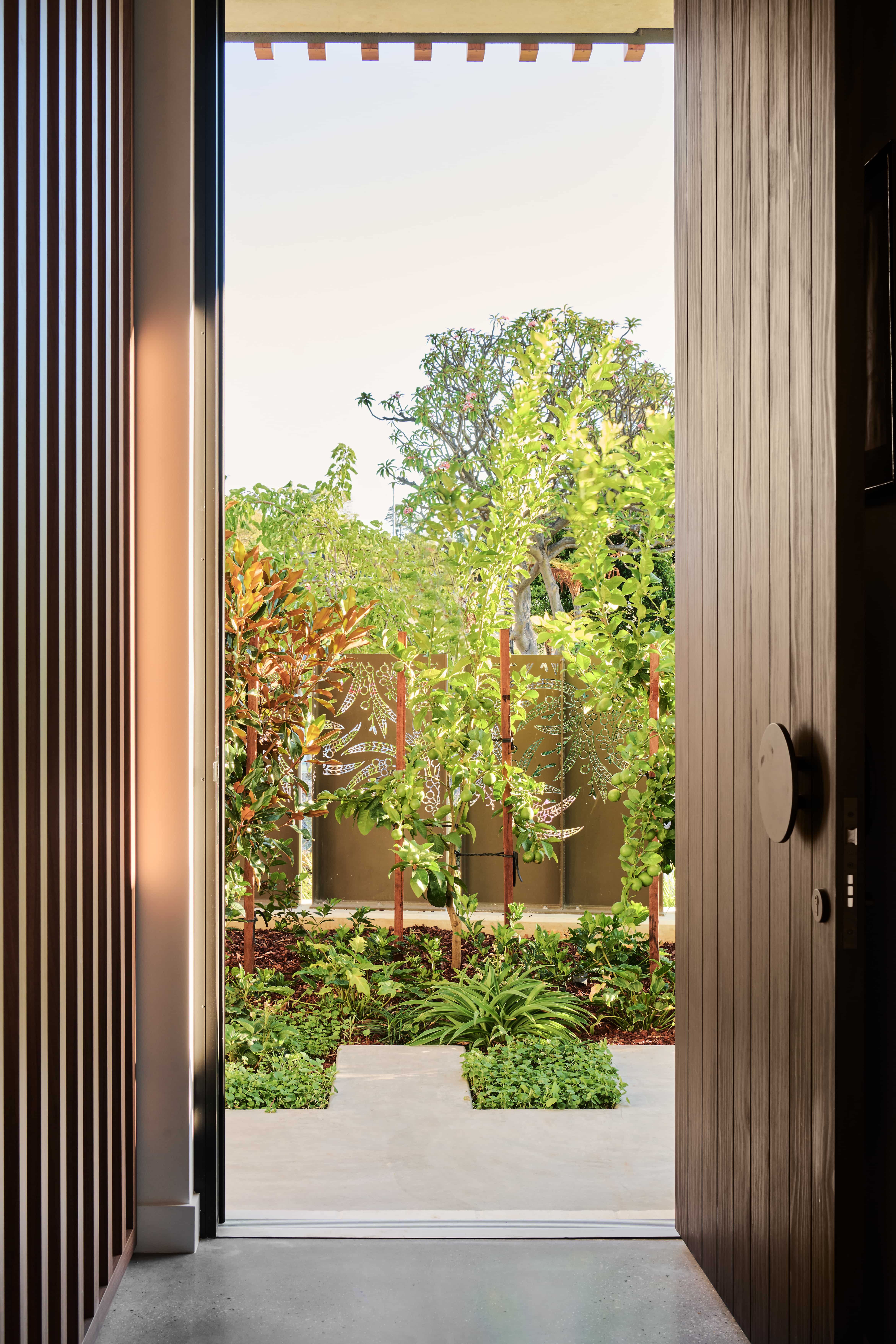 The raw, bold material palette of off-form concrete ceilings and dark cabinetry anchors the home, while considered design strategies including a 7-star energy rating, solar panels, electric heat pump and passive solar principles support natural ventilation and year-round comfort.