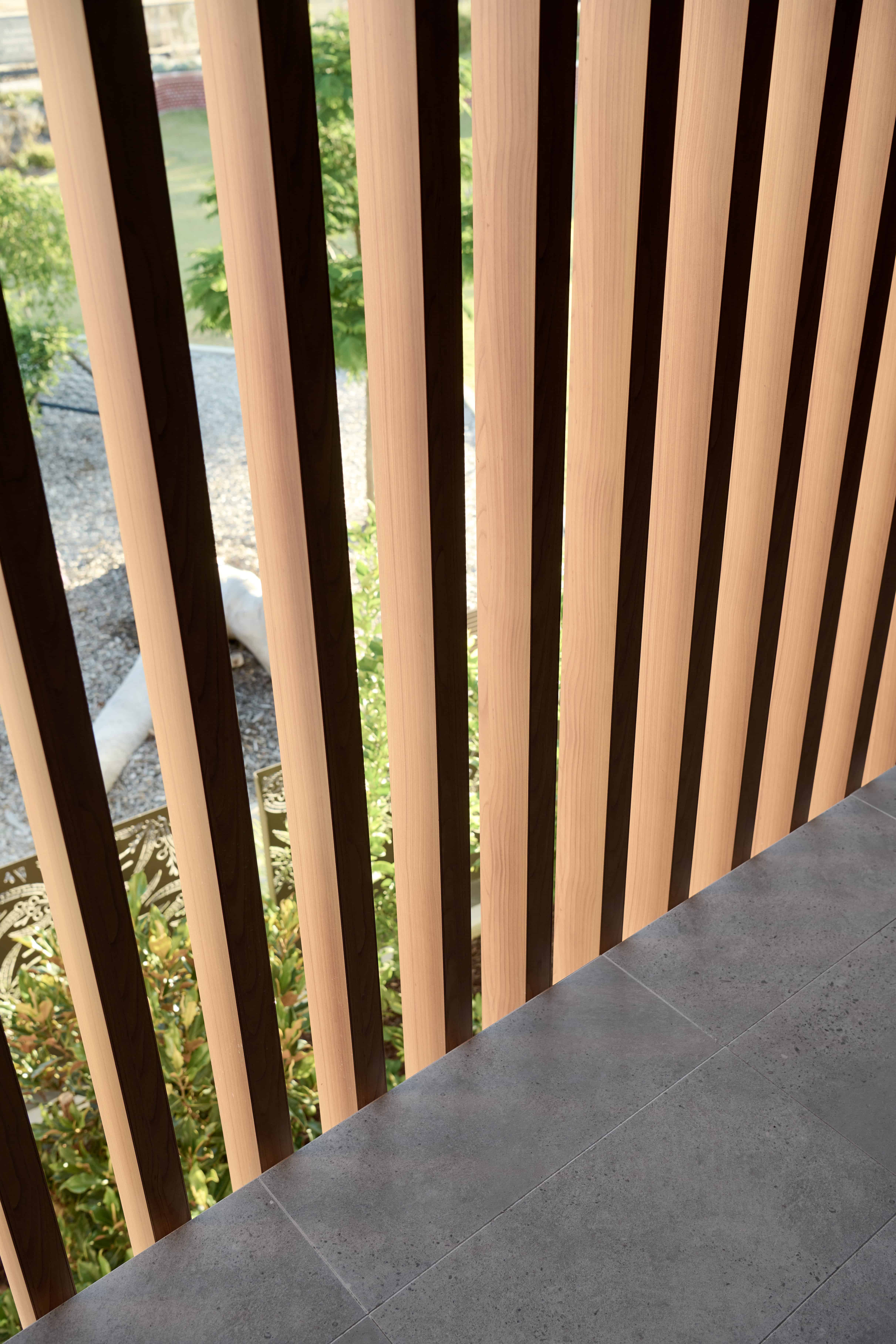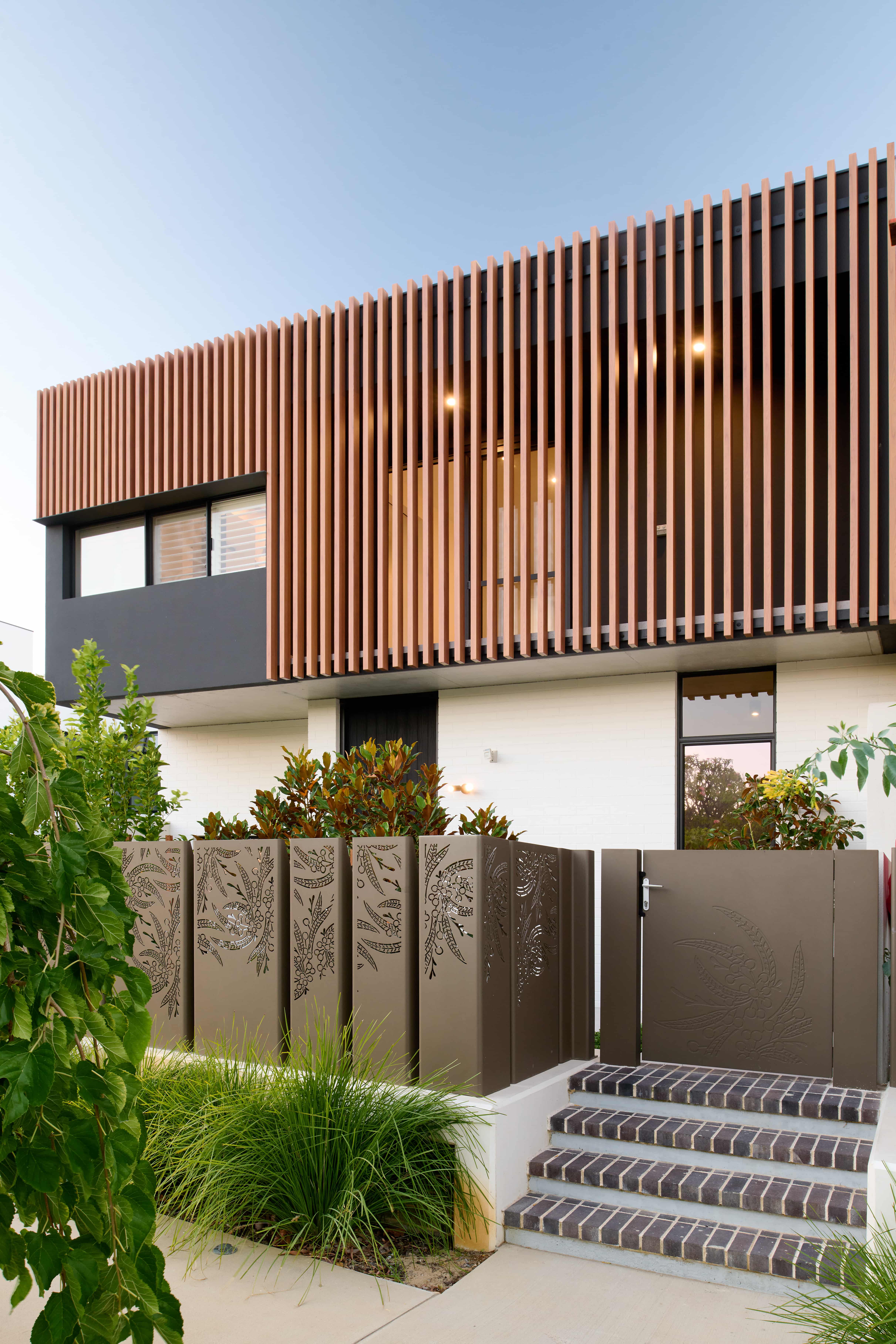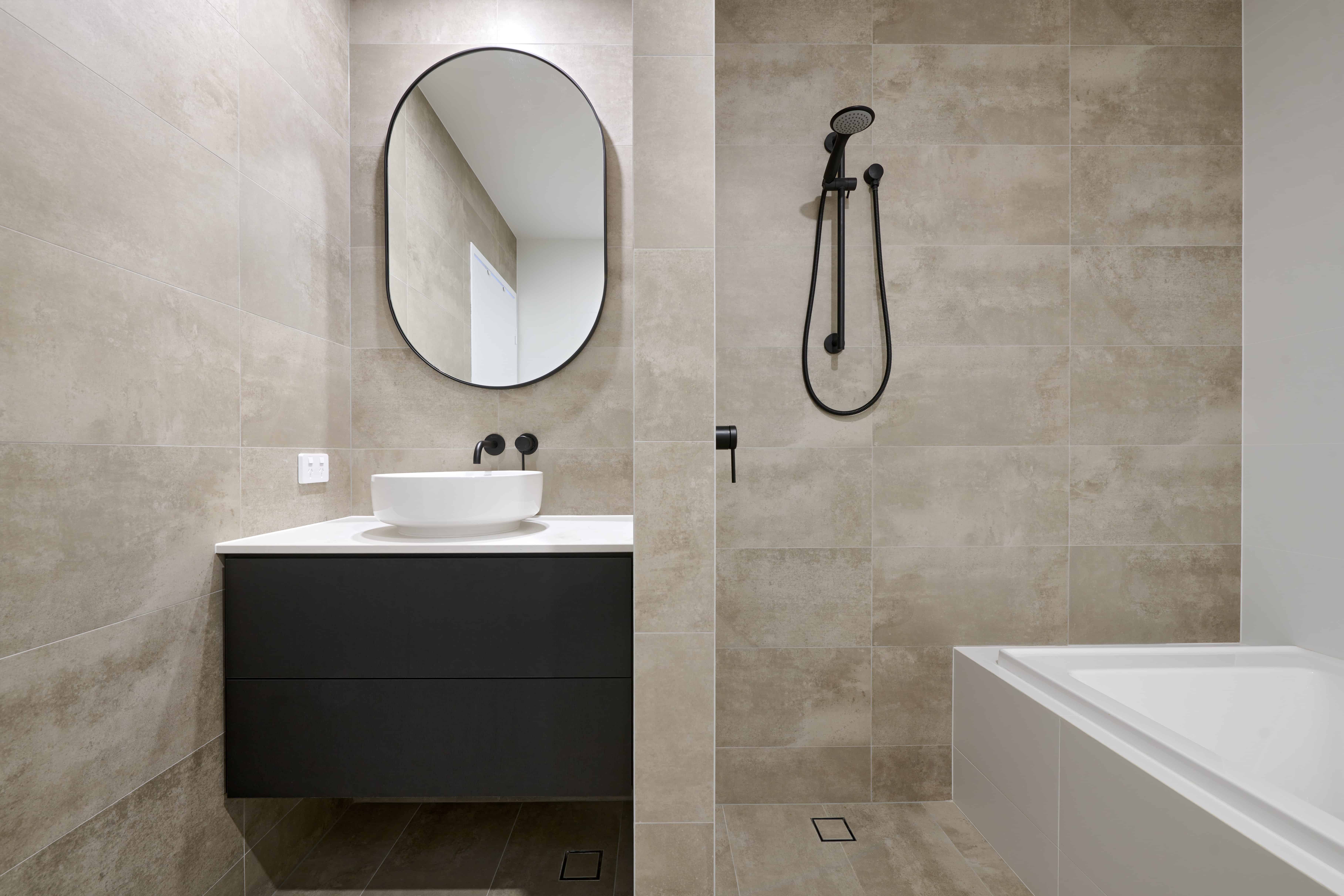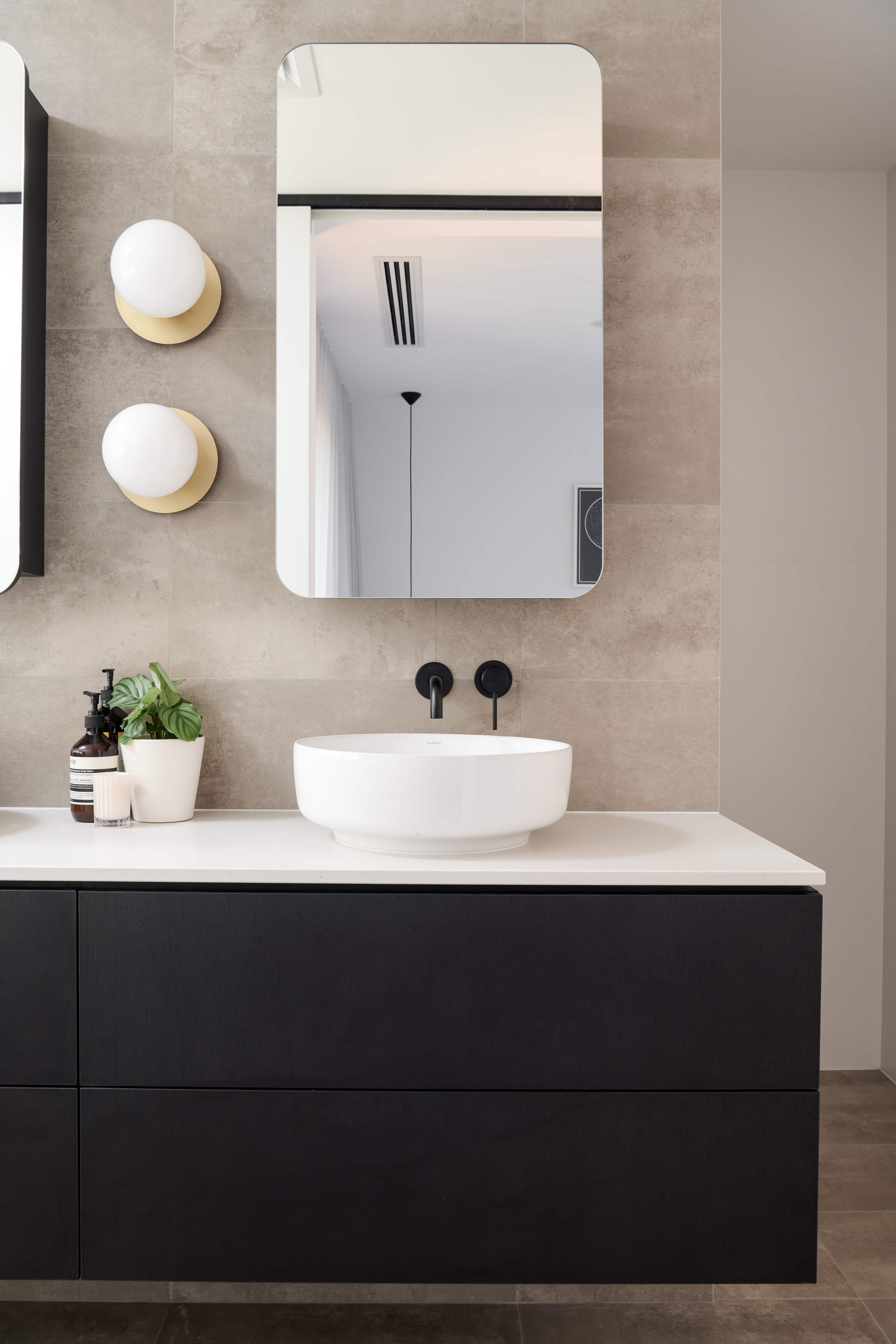 The raw, bold material palette of off-form concrete ceilings and dark cabinetry anchors the home, while considered design strategies including a 7-star energy rating, solar panels, electric heat pump and passive solar principles support natural ventilation and year-round comfort.