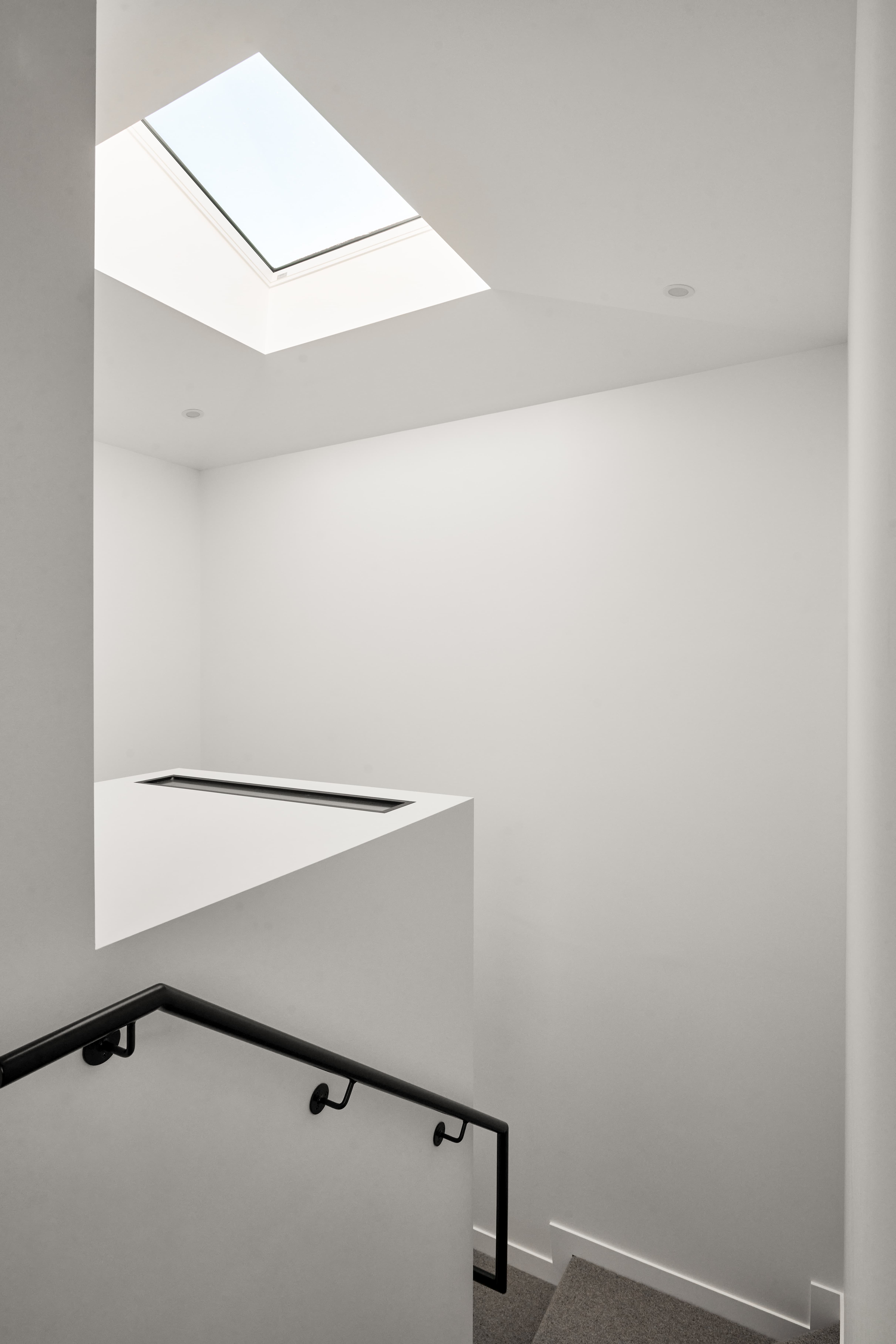 A modern, bespoke family home designed for a compact site, where expert planning and refined architectural detailing maximise every metre, with high ceilings and full-height glazing flooding the interior with natural light and framing views to the surrounding greenery.